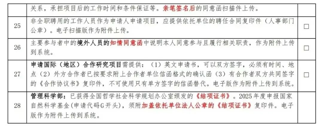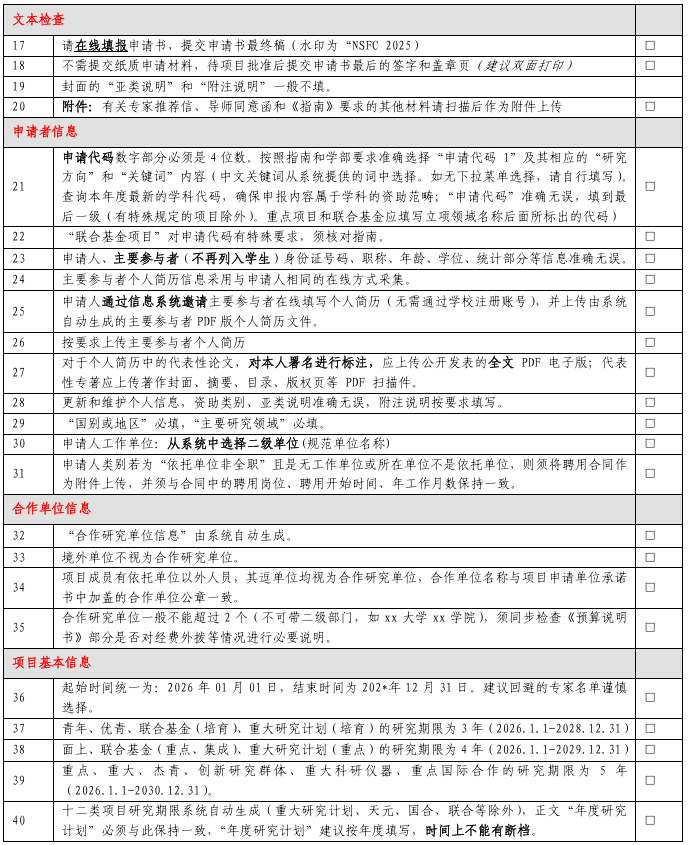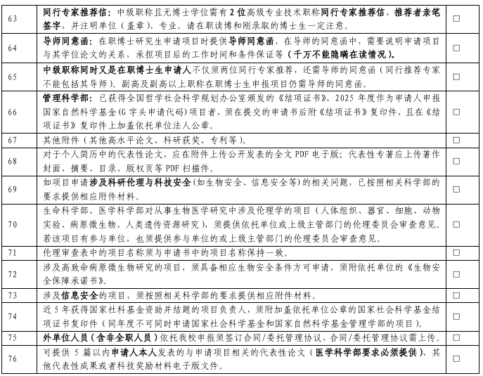 2025年度国家自然科学基金正式提交前要仔细阅读最新申报要求,以下是网上来自不同单位科研管理部门发布的2025年度国家自然科学基金形式审查明细表,分别为76项、28项。仅供参考。
