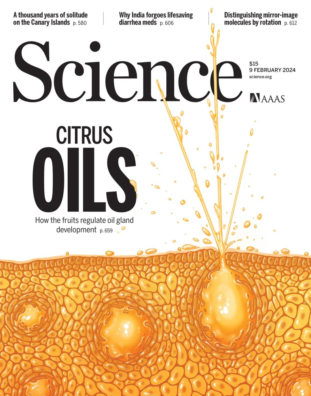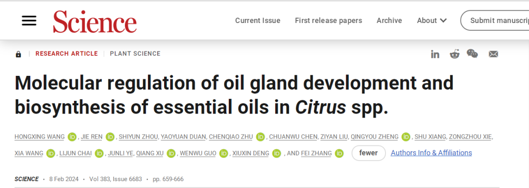 2024年2月9日,《科学》(Science)杂志以封面论文形式发表了果蔬园艺作物种质创新与利用全国重点实验室、华中农业大学柑橘团队邓秀新院士、张飞教授课题组题为“Molecular regulation of oil gland development and biosynthesis of essential oils in Citrus spp.”(柑橘油胞发育与精油合成的分子调控)的研究成果。研究以柑橘油胞为新模式系统,揭示了分泌囊起始和发育的分子调控通路,为提升金柑类果实鲜食品质和增加甜橙、柠檬等精油产值提供重要理论基础。