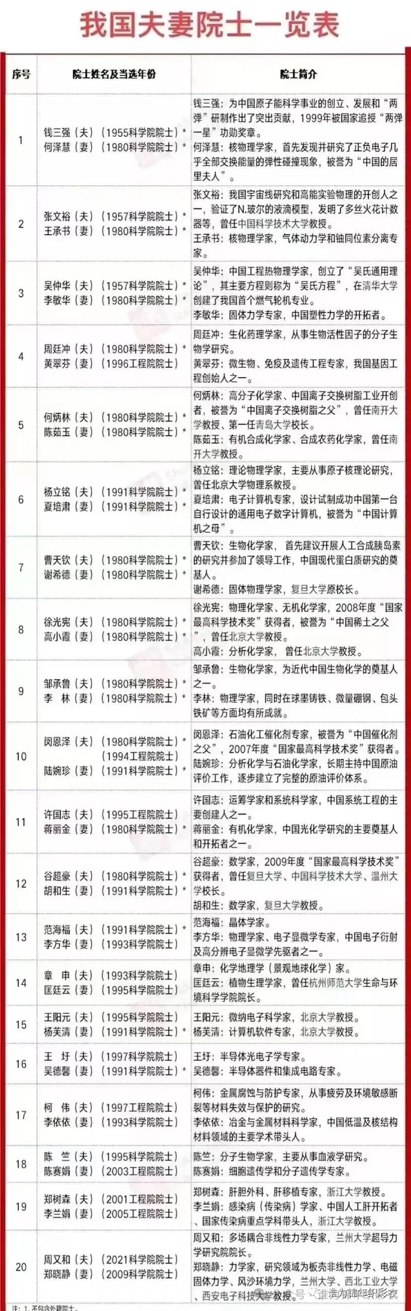 下图罗列了我国20对夫妻均是院士的名单,我们看到其实很多院士和院士之间,他们都有着千丝万缕的联系,这也和我们目前院士可以引荐的这个制度有着很大的关系,毕竟都是同一个学术圈子里的,大家对于各自的实力都有着知根知底的了解,所以互相推选一把也是很正常。而往往很多时候,爱情的种子就在某一瞬间生根发芽了。