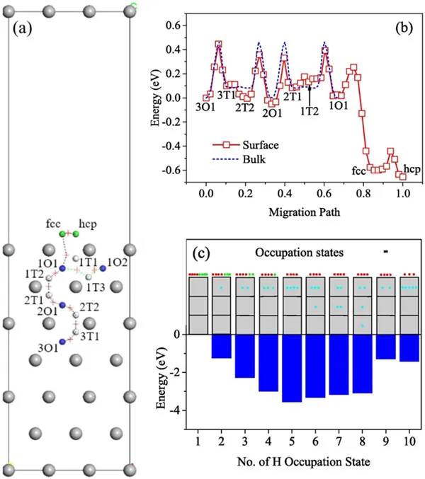 钛合金具有比强度高、耐海水腐蚀等特性,是深海装备的关键结构材料。深海低溶解氧浓度环境下,防护钛合金表面的氧化膜在应力作用下破裂后无法持续修复,钛合金结构面临应力腐蚀开裂的风险。氢脆是钛合金深海应力腐蚀开裂的主要原因,氢的吸附、扩散和氢诱发相变是影响钛合金应力腐蚀开裂敏感性的关键因素。为探究不同因素对钛合金氢脆的影响,并为开展面向应力腐蚀性能的钛合金材料优化设计提供支撑,杨锐、马英杰、胡青苗研究团队开展了理论计算及实验研究,取得了阶段进展。在理论计算方面,针对钛合金氢诱导开裂的关键机制,采用第一性原理方法研究了H与表面的相互作用及氢化物形成的热力学及动力学。研究表明,氢原子易在钛裂纹尖端表面吸附并由次表面到块体内部依次富集。随表面氢覆盖率升高,表面能和表面断裂功下降,可诱发解理断裂,加速裂纹扩展。同时,氢原子的局部富集可诱发氢化物在裂尖前端形成,产生氢化物致脆 (Appl. Surf. Sci. 621:156871(2023),DOI: 10.1016/j.apsusc.2023.156871)。自由能计算结果表明,α-Ti-H固溶体与δ/ε氢化物为平衡相,χ/γ氢化物为亚稳相。随氢原子浓度提高,氢化物形成过程中的HCP→FCC结构转变能垒显著下降;氢原子浓度超过临界阈值(H:Ti=48:108)可诱导自发结构相变。结构转变过程中滑移面上的氢原子可自发地从八面体间隙向四面体间隙转移,非滑移面氢原子的迁移则需热激活过程。(Acta Mater. 272: 119921 (2024),DOI: 10.1016/j.actamat.2024.119921)。结合理论计算结果,开展了钛合金中氢扩散及氢化物形成等实验研究。利用散裂中子源中子成像技术表征了氢扩散初期在α+β双相钛合金表面的富集以及时效过程中在样品中的自扩散行为,建立了中子透过率与氢含量的对应关系。研究结果表明,β相的氢固溶度远大于α相,氢扩散诱发的β晶格畸变更大,并进一步通过调幅分解片层的粗化进行协调。α晶粒中析出了不同氢化物变体,在氢化物界面处发现一种新的周期性结构,认为是氢化物转变的亚稳过渡相 (Scripta Mater. 256: 116410 (2025),DOI: 10.1016/j.scriptamat.2024.116410)。在此基础上,进一步研究了Fe、Cr等β稳定元素及氢对合金相变的耦合作用,对Ti-Fe和Ti-Cr二元β合金热处理充氢研究表明,氢的扩散降低了β相中Fe和Cr元素的固溶度,显著促进B2结构TiFe相和C15结构TiCr2相的析出,同时影响第二相与基体间的取向关系和相变协调机制。此外首次在钛合金中发现氢致BCC-FCC马氏体转变,Baker-Nutting (B-N) 和Kurdjumov-Sachs (K-S) 取向关系的FCC相变分别发生在TiFe和TiCr2相界面处,并伴随大量的内部孪晶 (Acta Mater. 120906 (2025),DOI: 10.1016/j.actamat.2025.120906)。相关工作有助于深入理解氢在钛合金表面吸附、扩散及氢化物形成机理,为面向抗应力腐蚀钛合金的成分、显微结构优化设计提供了理论依据,也为钛合金在氢能领域的推广应用提供了工作基础。以上研究工作得到国家自然科学基金创新研究群体 (52401177)、联合基金(U210620216)、青年基金 (52401177),国家重点研发计划项目(2021YFC2801800),博士后专项,中国科学院特别研究助理资助项目和中国博士后科学基金面上项目(2022M723213)等资助。图1. 氢原子倾向于向Ti表面扩散:(a)路径,(b)势能曲线以及(c)不同分布状态下的相对能量。图2. (a) HCP-Ti以及FCC氢化物的BCT视角,(b) 不同氢掺杂方式的α-Ti和TiHm 形成能,(c) α-Ti→TiHm相结构转变势能曲线,(d) 相变中的氢原子扩散势垒。图3. (a) 中子成像氢分布图,(b,c) β相中条幅分解片层形貌,(d,e) α相中氢化物及亚稳过渡相形貌。图4. 氢诱发TiFe和TiCr2相,相界面处的FCC层以及β相与FCC相间的取向关系。