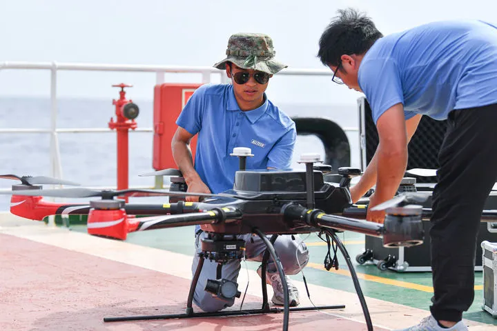 工作人员在“电科1号”综合试验船上调试无人机(2023年6月15日摄)。新华社记者 蒲晓旭 摄