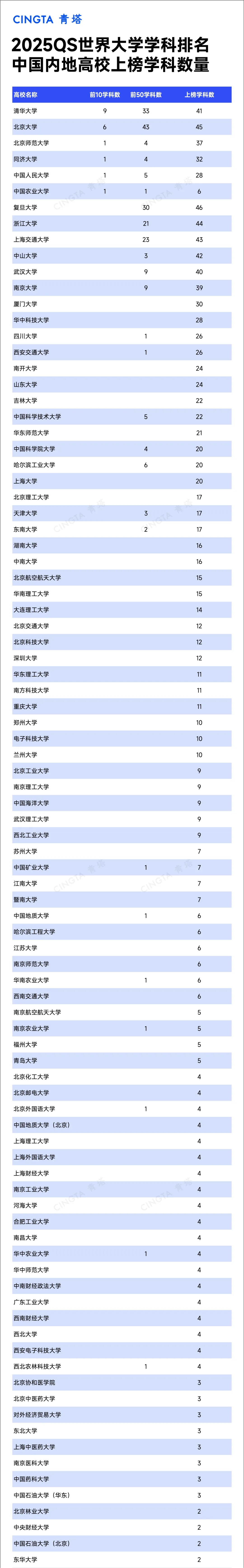 共有29所中国内地高校的217个学科跻身世界前50强。其中北京大学共有43个,清华大学有33个,复旦大学则有30个学科,前50学科数居于前三甲。上海交通大学、浙江大学也有超过20个学科跻身世界前50。