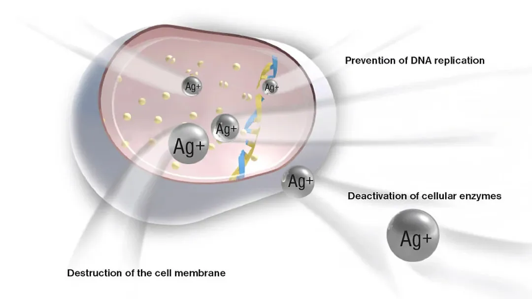 接触抗菌的机理是:病菌的细胞膜和细胞壁表面为负电荷,而在库仑力的作用下,带正电的Ag⁺会与细胞壁和细胞膜结合。 在Ag⁺与细胞壁接触的过程中,Ag⁺会抑制肽聚糖的合成,导致细胞壁破裂,破坏病菌结构,达到灭活的效果。而当Ag⁺被吸附到细胞膜内时,一方面会与蛋白质上的巯基 (−SH) 反应结合,导致蛋白质变性;另一方面Ag⁺与蛋白质产生络合反应,破坏蛋白质的空间结构,蛋白酶失活后会影响细菌的分裂繁殖、呼吸作用等正常生物机能。此外,Ag⁺会破坏病菌的遗传物质(DNA或RNA),导致其失去繁殖能力。而且当菌体失去活性后,Ag⁺又会从菌体中游离出来,重复进行杀菌,因此产生持久的抗菌效果。