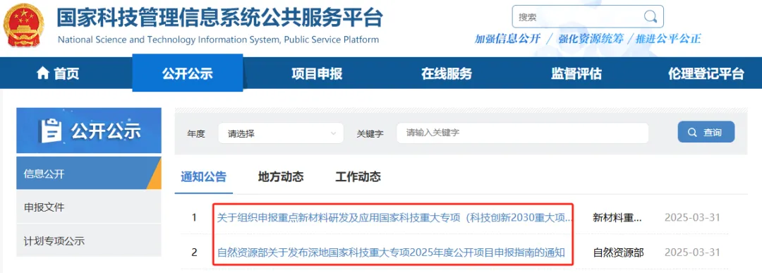 1.重点新材料研发及应用国家科技重大专项2025年度项目申报指南(公开竞争类)