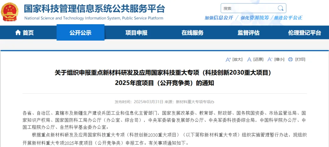 关于组织申报重点新材料研发及应用国家科技重大专项(科技创新2030重大项目)2025年度项目(公开竞争类)的通知