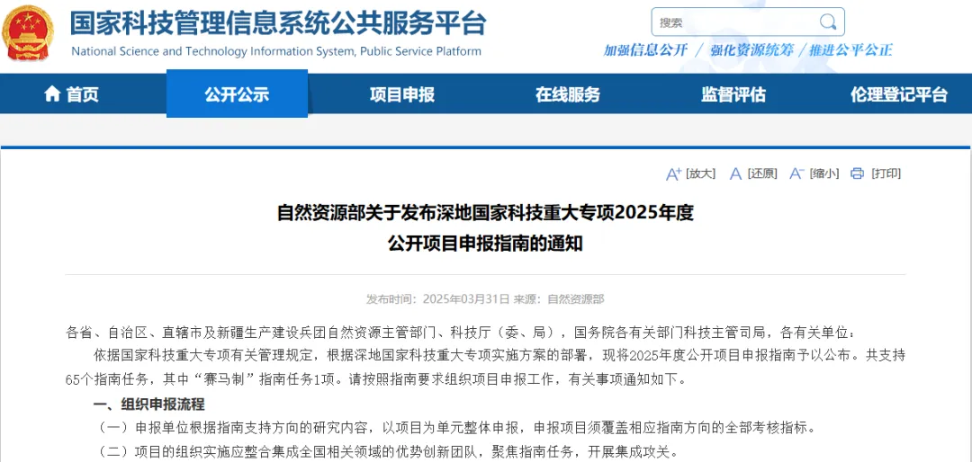 依据国家科技重大专项有关管理规定,根据深地国家科技重大专项实施方案的部署,现将2025年度公开项目申报指南予以公布。共支持65个指南任务,其中“赛马制”指南任务1项。请按照指南要求组织项目申报工作,有关事项通知如下。