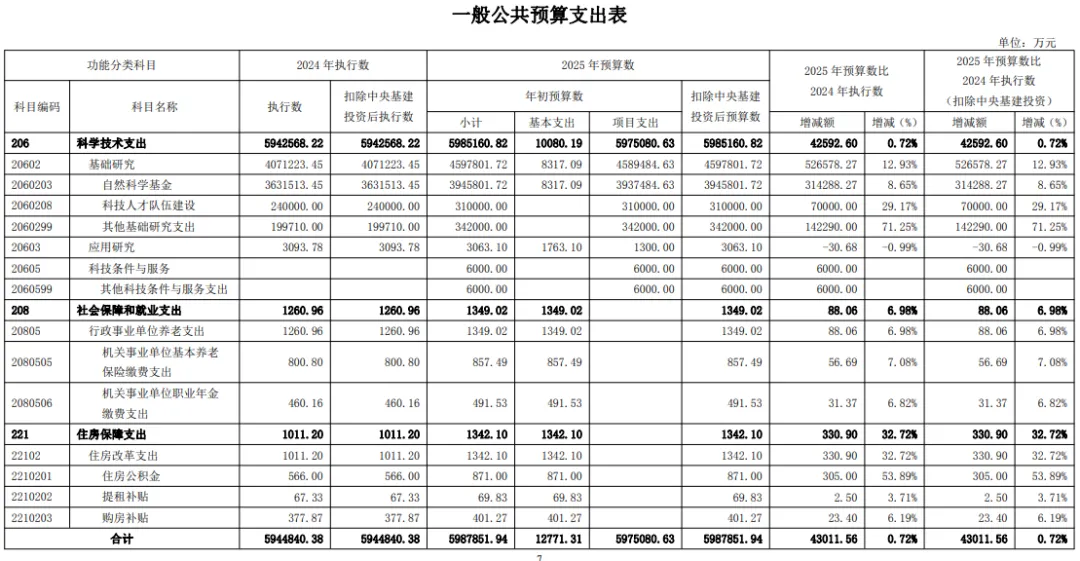 国家自然科学基金委员会网站公布《2025年度部门预算》,今年自然科学基金项目预算数有较大增长。2025 年一般公共预算财政拨款支出预算 5987851.94 万元, 比 2024 年执行数 5944840.38 万元增加 43011.56 万元,增长 0.72%。按照支出功能分类,2025 年预算数比2024 年执行数增加较为明显的项级支出科目为 2060203 自然科学基金,2025年预算数为 3945801.72 万元,比 2024 年执行数增加314288.27万元,增长 8.65%。按照支出功能分类,基础研究方面的支出占部门支出总额的比重较高,主要是:2060203 自然科学基金,2025年预算数为 3945801.72 万元,占部门一般公共预算支出总额的65.9%,主要用于面上项目、青年科学基金项目(A/B/C类)、地区科学基金项目、创新研究群体项目等18 类项目资助经费支出和各类项目资助有关的评审活动、信息系统运行维护等方面的支出。 1.科学技术支出(类)基础研究(款)自然科学基金(项)2025 年预算数为 3945801.72 万元,比2024 年执行数增加314288.27 万元,增长 8.65%,主要原因是中央财政对自然科学基金的投入增加。 2.科学技术支出(类)基础研究(款)科技人才队伍建设(项)2025 年预算数为 310000万元,比 2024 年执行数增加70000万元,增长 29.17%,主要原因是人才专项支出增加。3.科学技术支出(类)基础研究(款)其他基础研究支出(项) 2025 年预算数为 342000 万元,比 2024 年执行数增加142290万元,增长 71.25%,主要原因是其他基础研究资助项目支出增加。