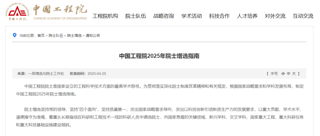 中国工程院院士是国家设立的工程科学技术方面的最高学术称号。为贯彻落实深化院士制度改革精神和有关规定,根据国家战略需求和学科发展布局,制定中国工程院2025年院士增选指南。