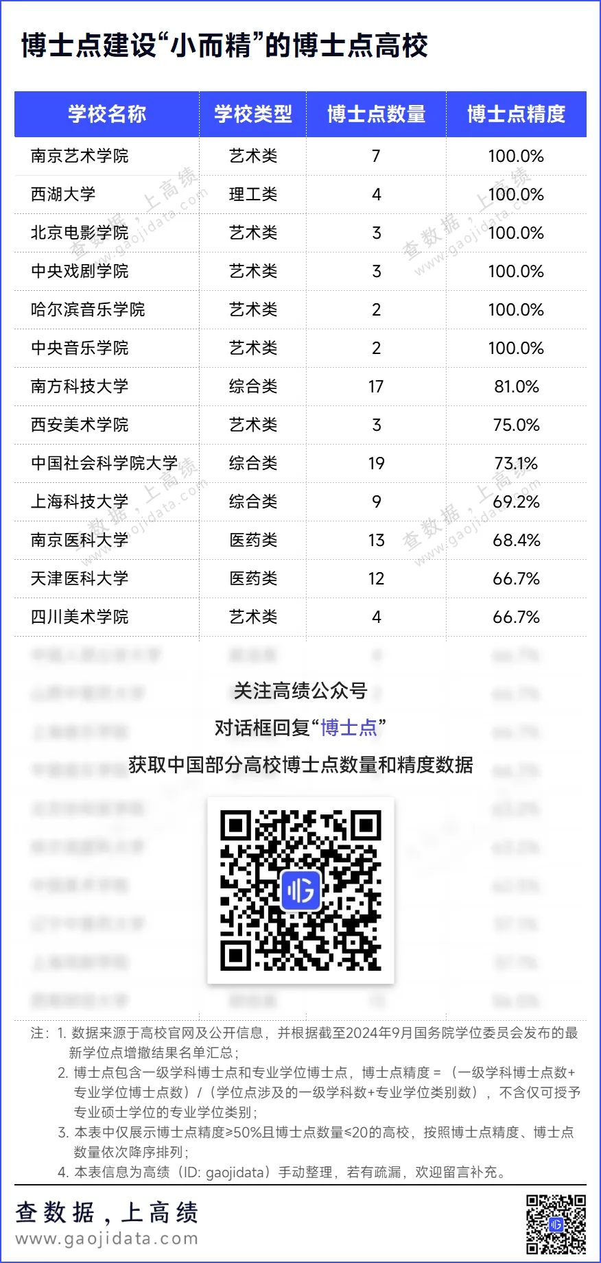 还有一批高校保持非常高的博士点精度,主要是新型研究型大学和艺术类高校、医药类高校,学校能够将资源聚焦在优势特色学科上,大力发展高质量博士教育,同样是具备高水平建设实力的博士点院校。