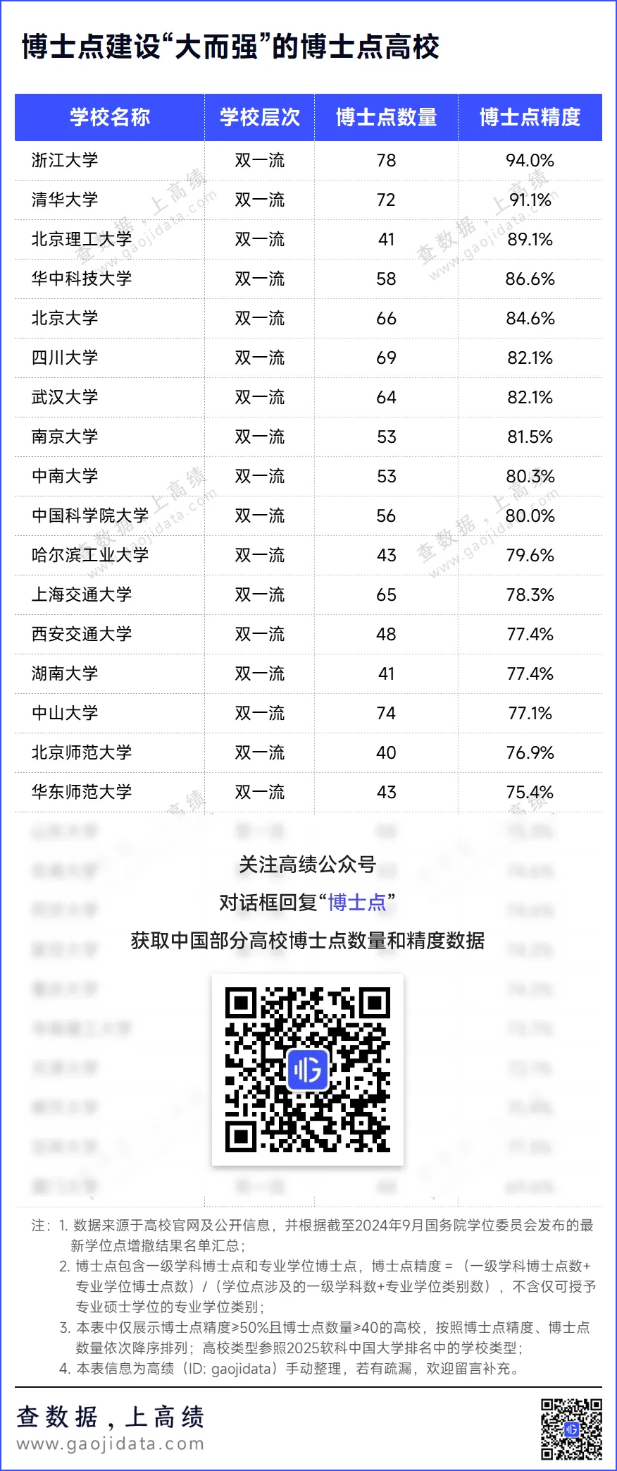 浙江大学在博士点精度和博士点数量上是当之无愧的全国榜首,学校有78个博士点,博士点精度高达94.0%;清华大学的博士点精度也超过90%,是我国博士点精度最高的两所“双一流”高校。