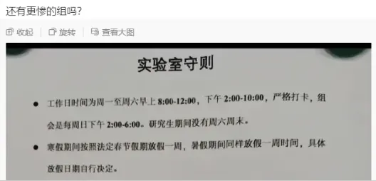 研究生有自己的规则怪谈,这可能就写在课题组的要求里......工作日时间为周一至周六早上8:00-12:00,下午2:00-10:00,严格打卡,组会是每周日下午2:00-6:00。研究生期间没有周六周末。寒假期间按照法定春节假期放假一周,暑假期间同样放假一周时间,具体放假目期自行决定。如果发表了1篇SC1论文,可放假3天,如果没有,就请在实验室努力。● 资本家看了都落泪,写完才给3天假