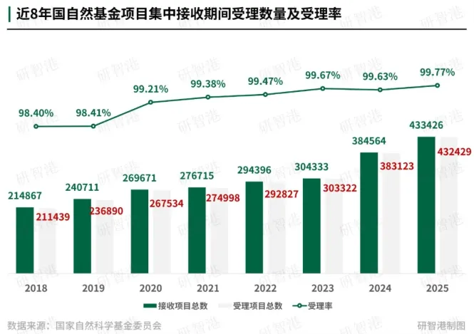 4月29日,2025国自然初审结果公布,据通告,基金委今年共受理项目申请432429项,不予受理项目申请997项。