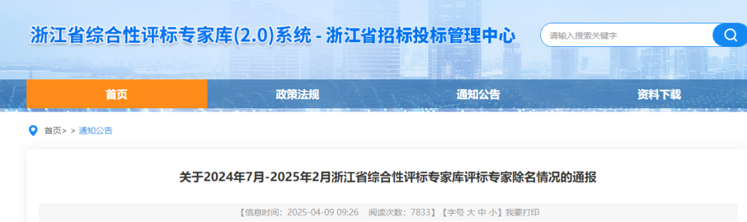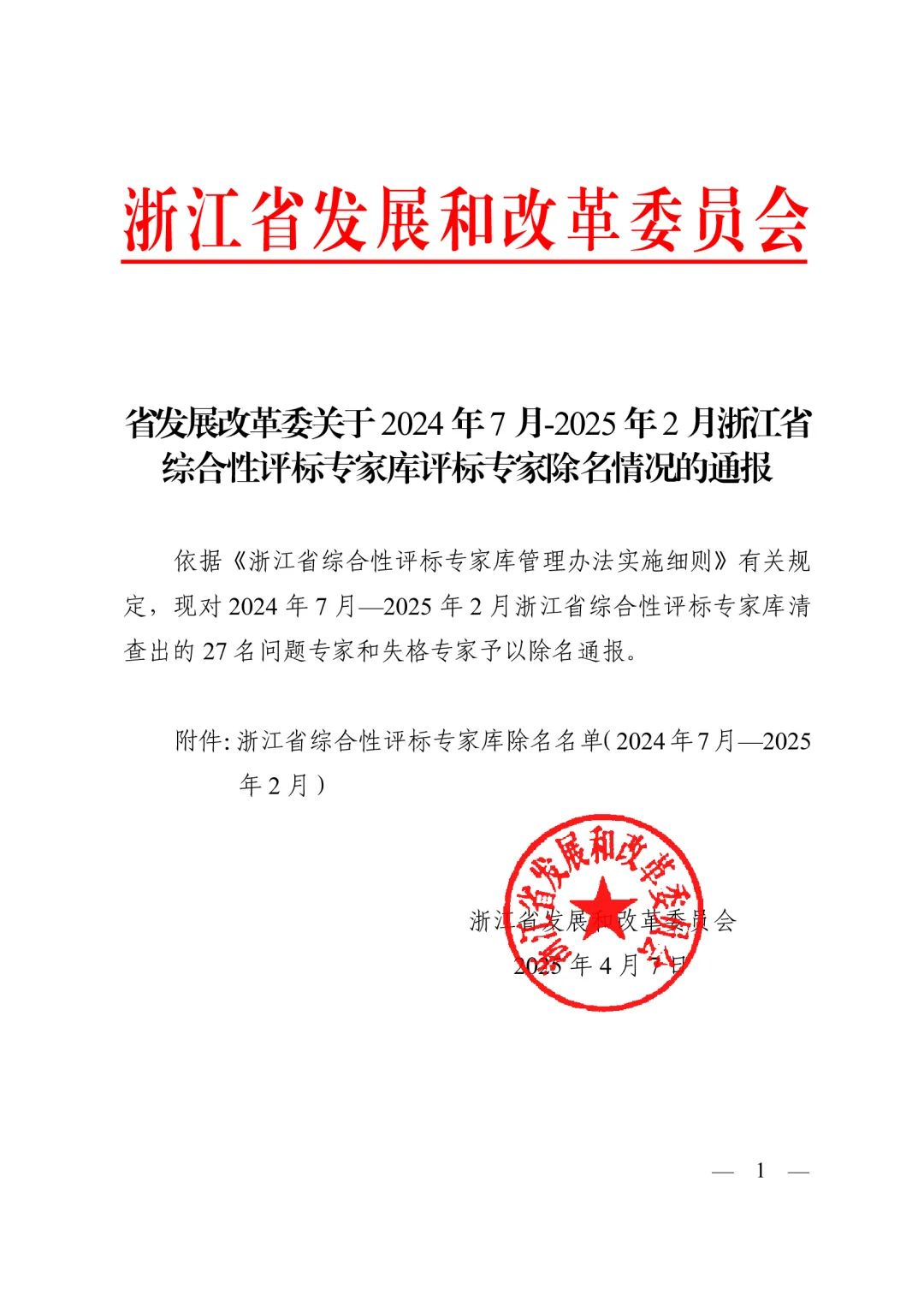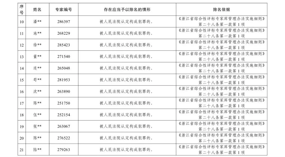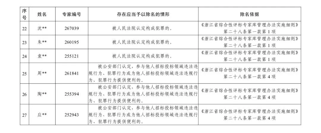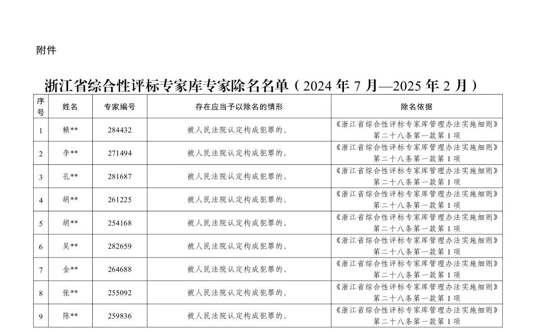 近日,浙江省发展和改革委员会依据《浙江省综合性评标专家库管理办法实施细则》有关规定,现对2024年7月-2025年2月浙江省综合性评标专家库清查出的27名问题专家和失格专家予以除名通报。 其中24名专家因被人民法院认定构成犯罪予以除名,另有3名专家被公安部门认定,参与他人招标投标领域违法违规行为、犯罪行为或为他人招标投标领域违法违规行为,犯罪行为提供便利予以除名。