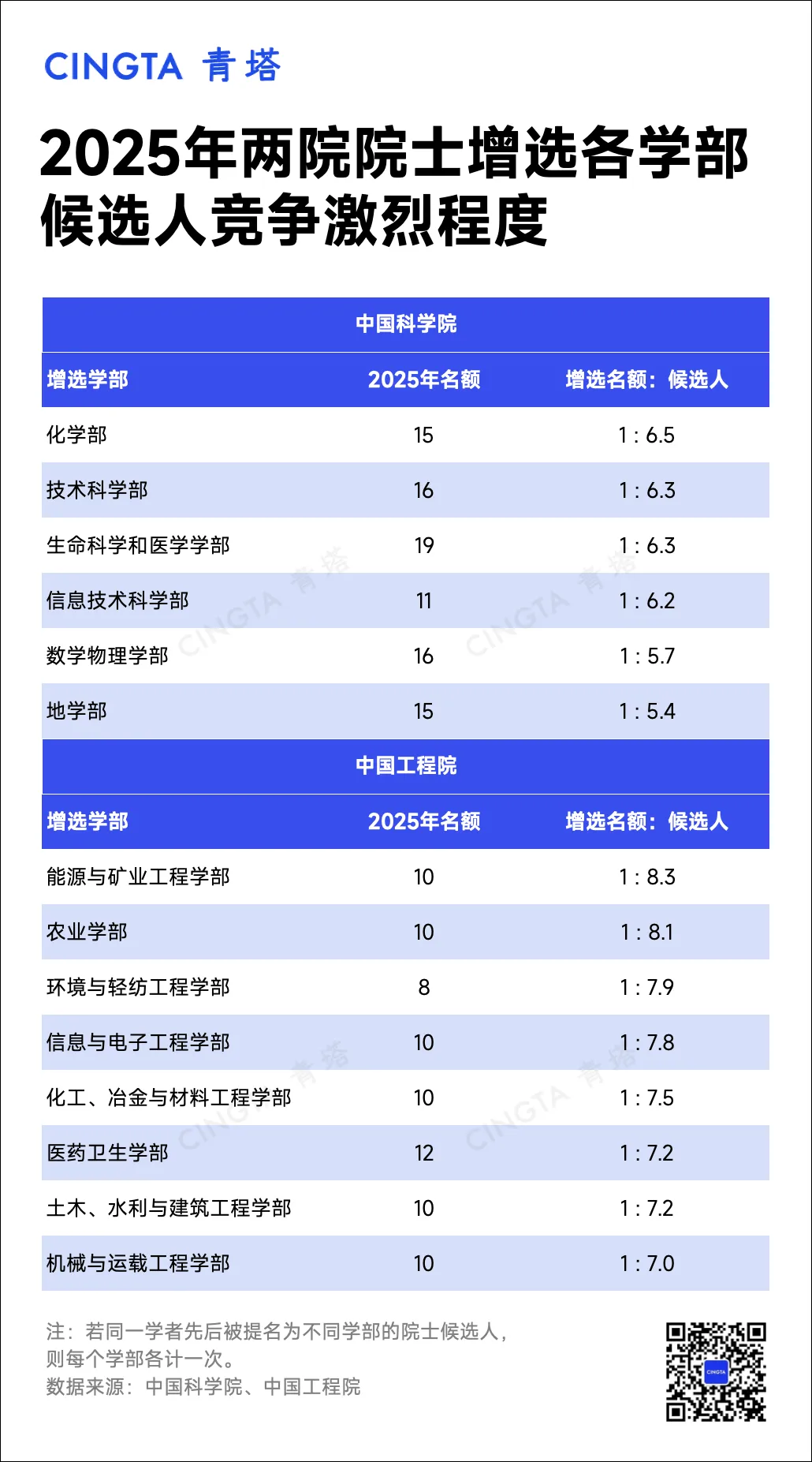 不过对比2025年两院院士增选指南中的名额分配方案,各学部的竞争情况有所变化。总体来说,中国工程院院士候选人的竞争更加激烈,其中角逐最白热化的当属能源与矿业工程学部,增选名额与现有院士候选人数量之间的比值约为1 : 8.3,冲击院士的难度最大;在中国科学院,竞争最激烈的是化学部,比值为1 : 6.5。