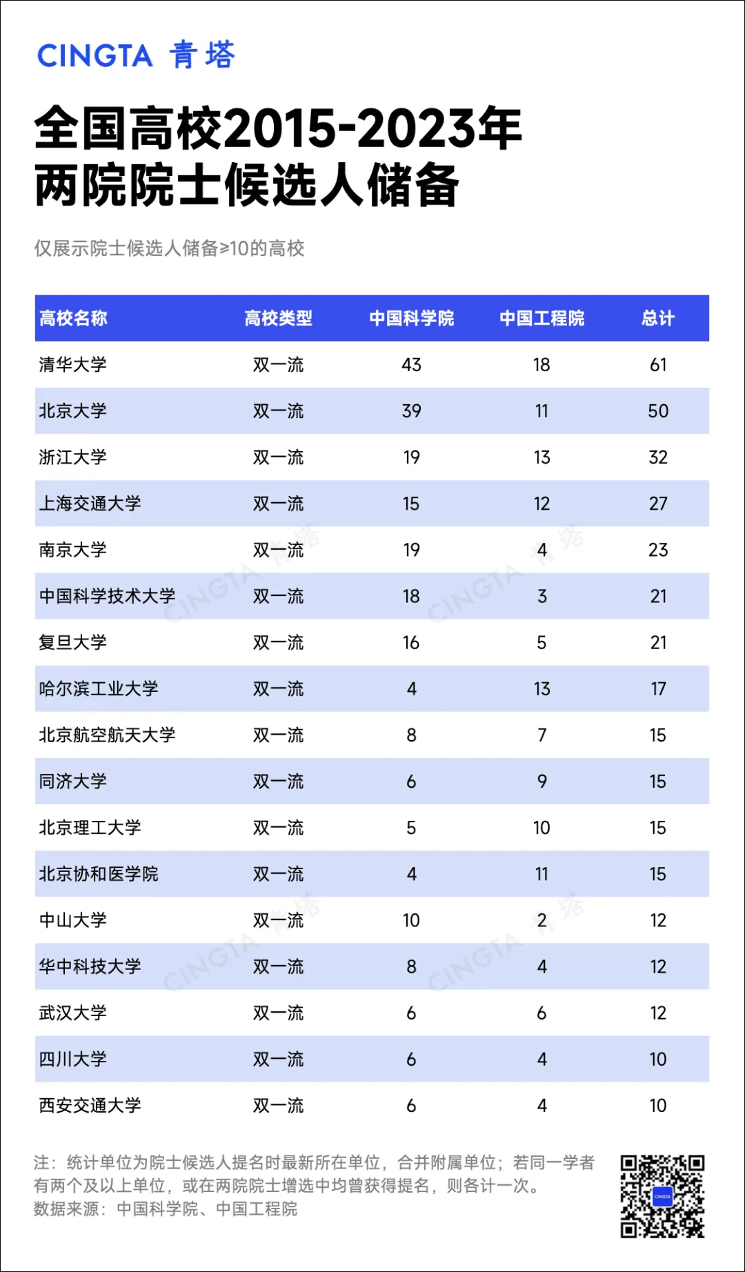 报告汇总的近5届两院院士候选人名单包括2015、2017、2019、2021年中国科学院院士增选初步候选人、中国工程院院士增选二轮候选人,以及2023年两院院士有效候选人。