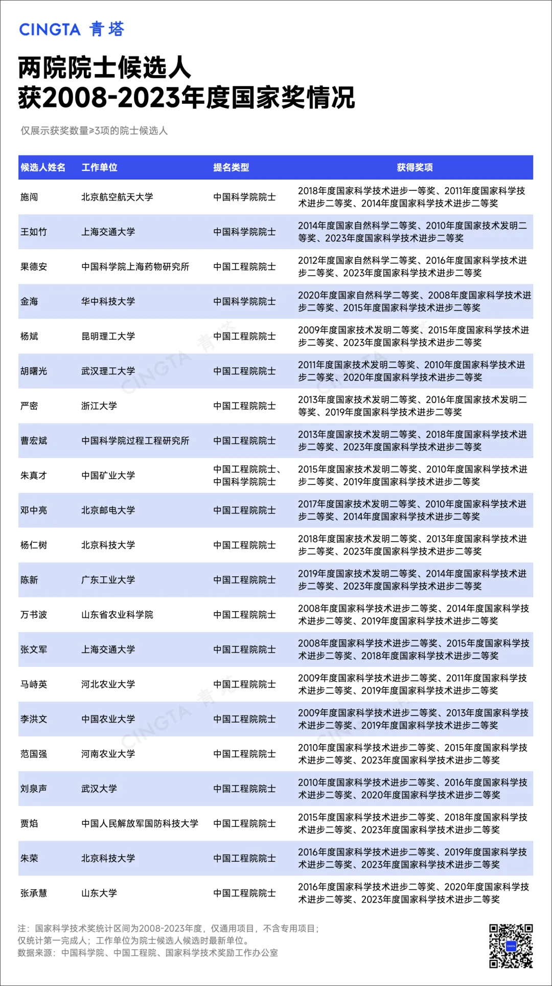 值得一提的是,中国科学院过程工程研究所曹宏斌研究员、山东大学张承慧教授,均在主持完成3项国家科学技术奖项目的同时,获得了全国创新争先奖、何梁何利奖、光华工程科技奖,拥有冲击2025年两院院士的雄厚资本。