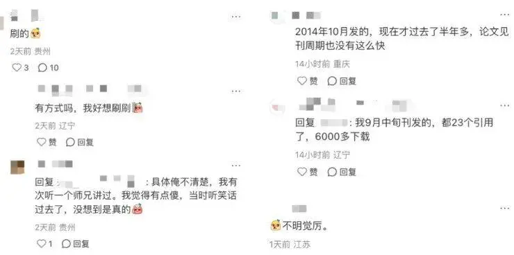 在评论区网友感到疑惑甚至质疑:“从发表到今年5月,7个月平均每天4500多次的下载量,这也太离谱了吧”“是不是刷量的”。也有人表示,“引用量为0也可能是正常现象,毕竟刚发表不久”。另有评论指出:“这篇文章发表在CSSCI核心期刊《心理科学进展》,按理说质量较高,可能只是引用文章还没发表。”