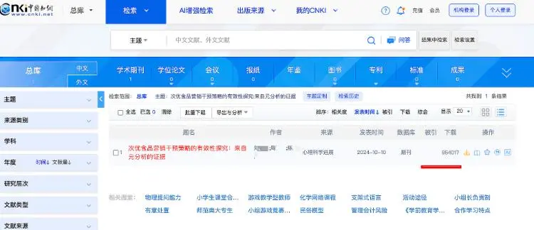 网友在社交平台发帖称,在知网检索中发现一篇2024年10月发表的论文《次优食品营销干预策略的有效性探究:来自元分析的证据》,显示其累计被下载954017次,但引用次数为0。该期刊系北京大学核心期刊及CSSCI核心期刊。