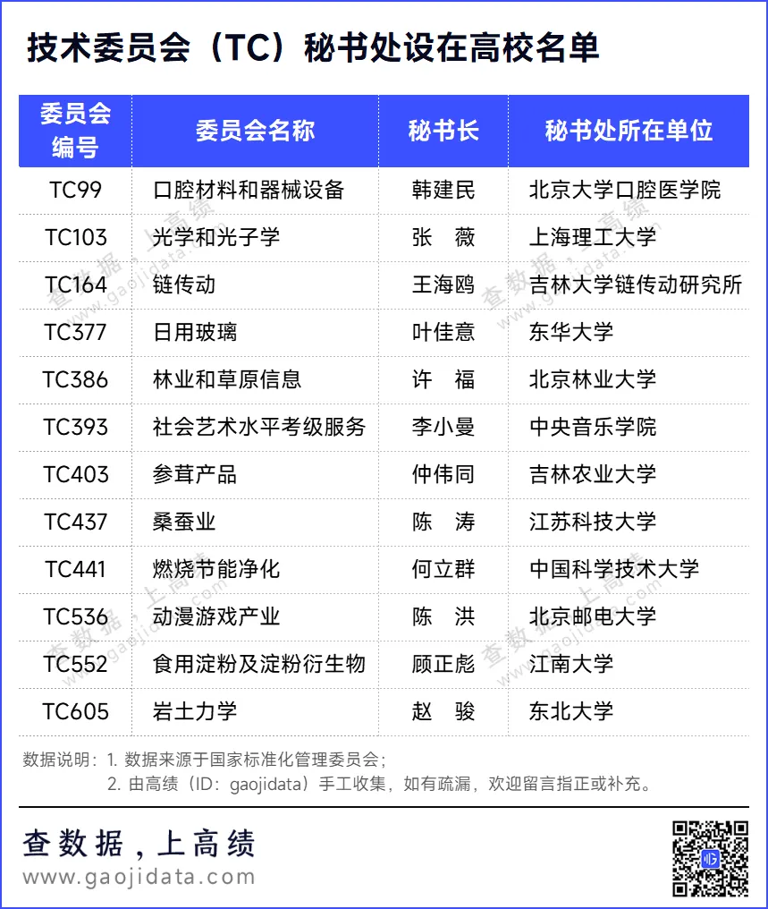 根据《全国专业标准化技术委员会管理办法》,技术委员会由委员组成,每届任期5年。委员不少于25人,其中设主任委员(负责技术委员会全面工作)和副主任委员;设秘书处,负责技术委员会日常工作。据统计,有12个技术委员会秘书处设在高校。