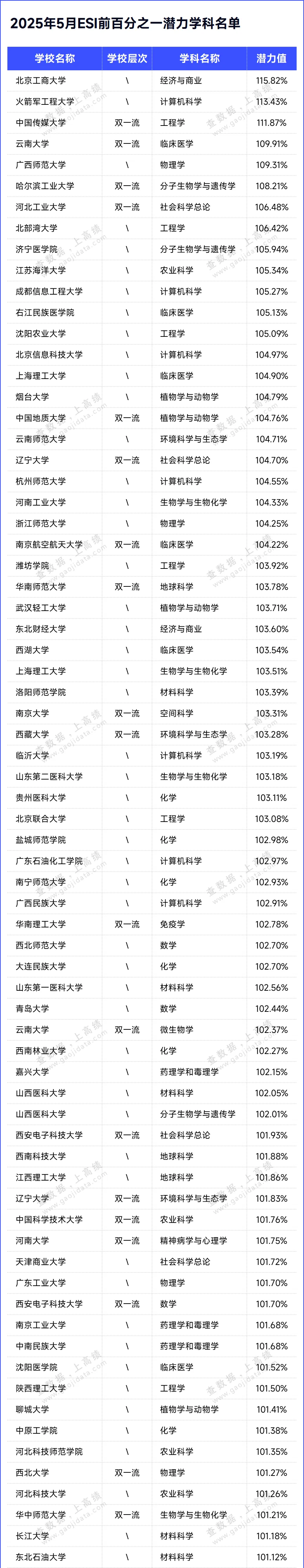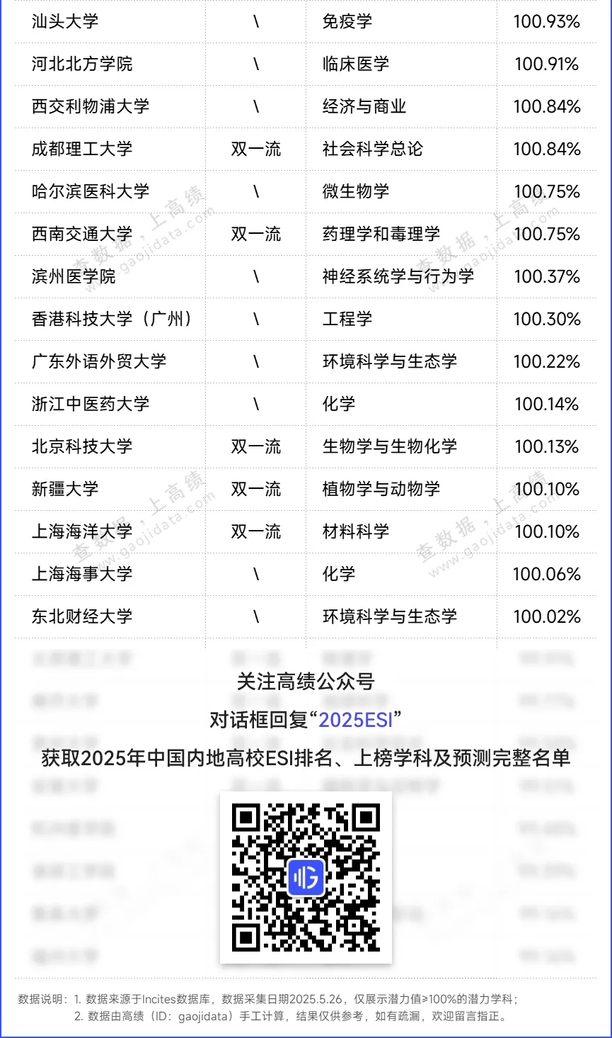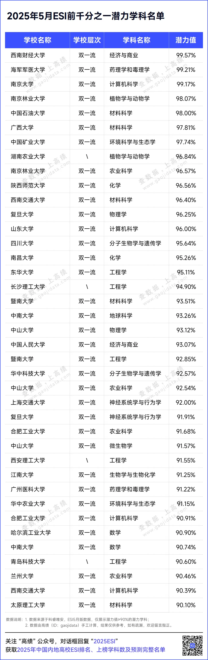 此外,湖南农业大学、长沙理工大学、西安理工大学、青岛科技大学4所非“双一流”高校的学科潜力突出,有望在7月ESI前千分之一学科中占一席之地。