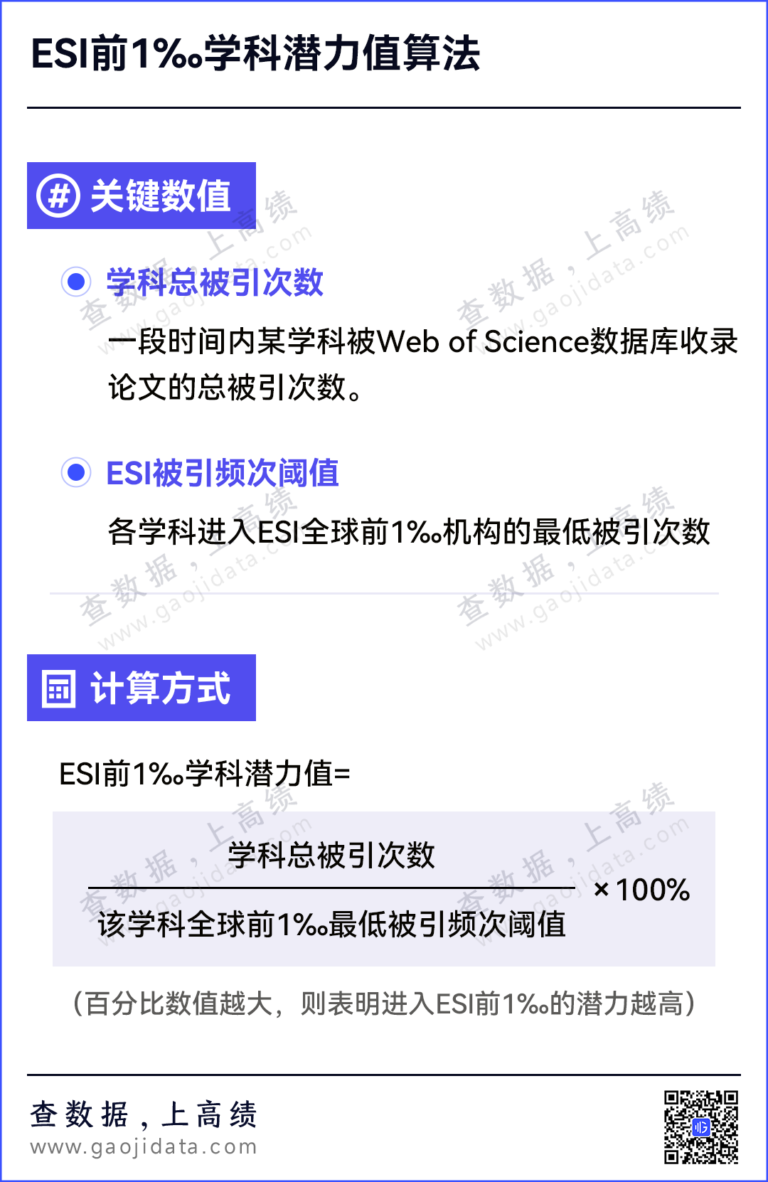 ESI(Essential Science Indicator,基本科学指标数据库)是科睿唯安研发的论文影响力分析工具,分22个学科提供了被引次数位列全球前1%的高校和科研机构,是判断高校学科发展水平的重要参考。