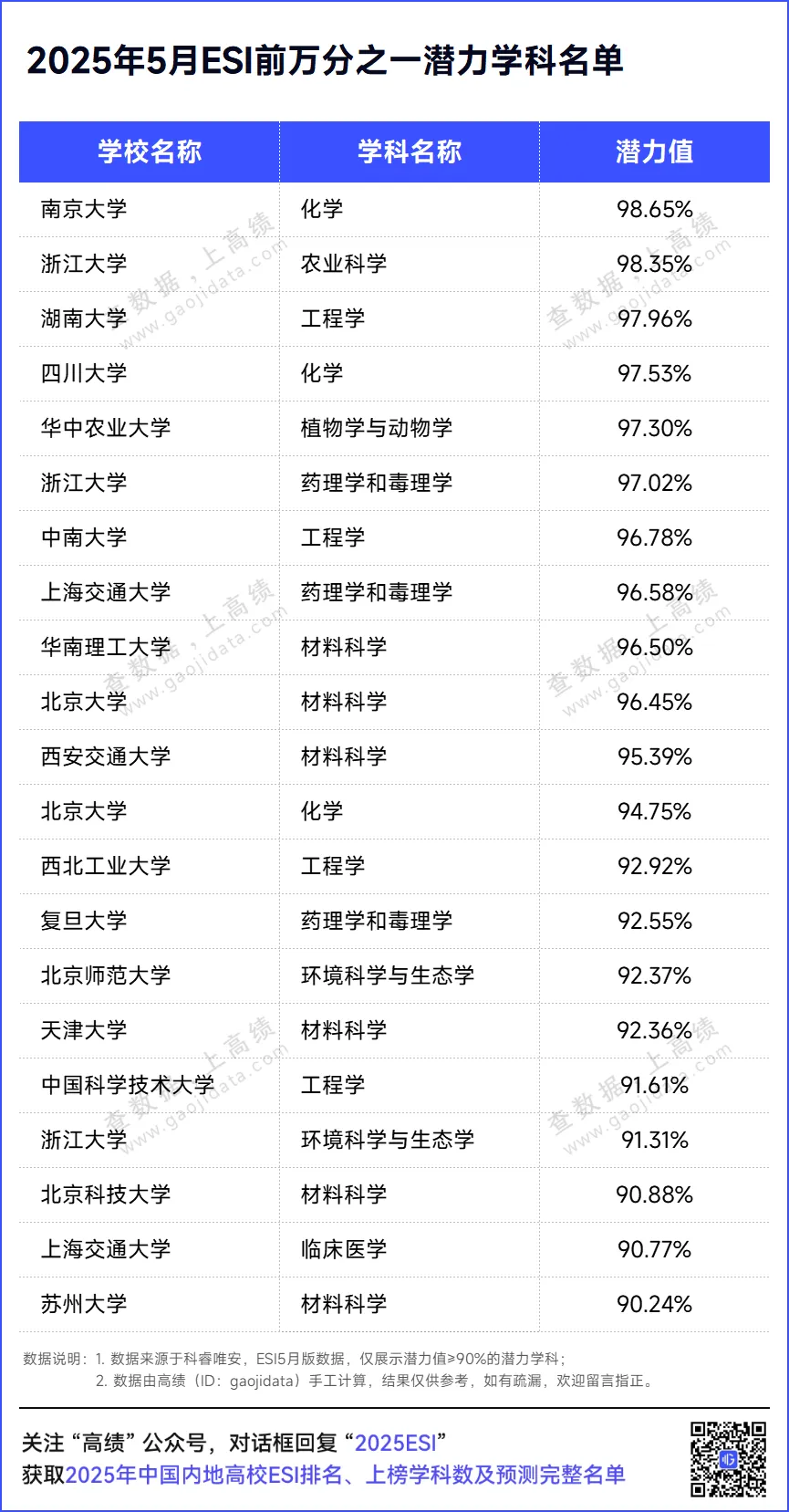 5月8日,科睿唯安(Clarivate Analytics)公布了2025年5月ESI学科排名,与3月相比,2所高校各新增1个ESI前万分之一学科,23所高校新增27个ESI前1‰学科,54所高校新增62个ESI前1%学科。ESI每2个月公布1次,哪些高校的学科有望在7月榜单中有所突破呢?