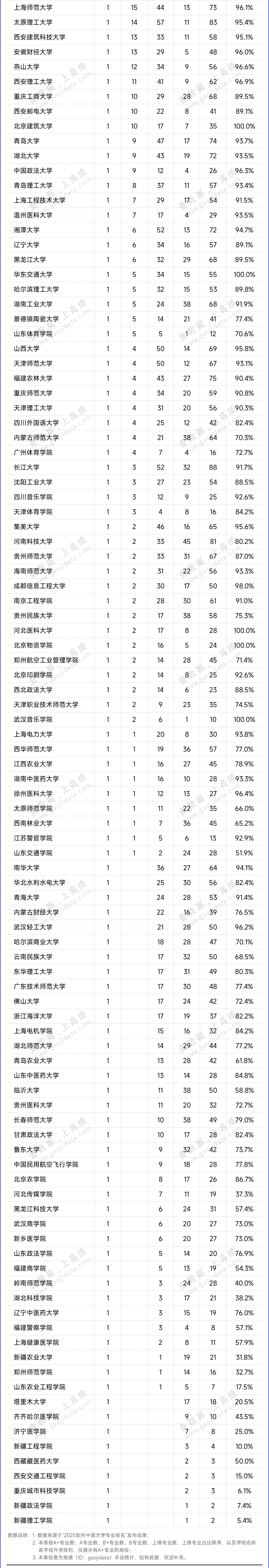 按照上榜专业数统计,北京大学有120个专业上榜,领先国内其它高校;吉林大学以119个上榜专业紧随其后;哈尔滨工业大学和武汉大学则以112个上榜专业并列全国第三;西南大学、四川大学、华中科技大学、扬州大学、苏州大学、郑州大学、贵州大学、重庆大学等8所高校上榜专业数皆超百。