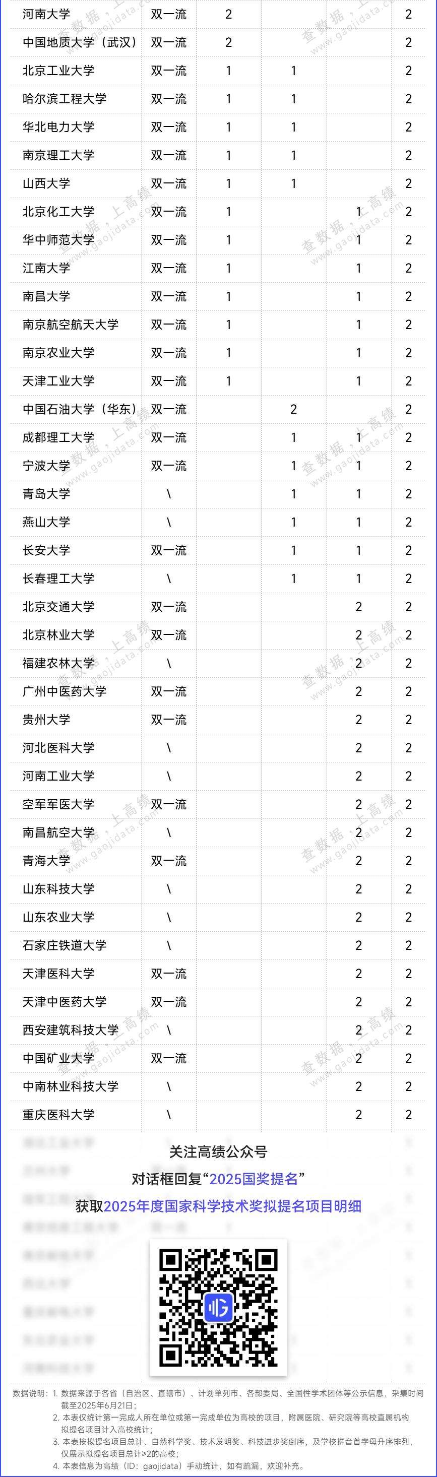 据国家科学技术奖励工作办公室发布的《2025年度国家科学技术奖提名工作》提名时间要求,网络填报截止时间是2025年6月30日。当前,各省市、国家部委、学会协会等单位的提名工作正紧锣密鼓推进。高绩(ID:gaojidata)将持续关注提名动态,收集2025年度国家科学技术奖拟提名项目。