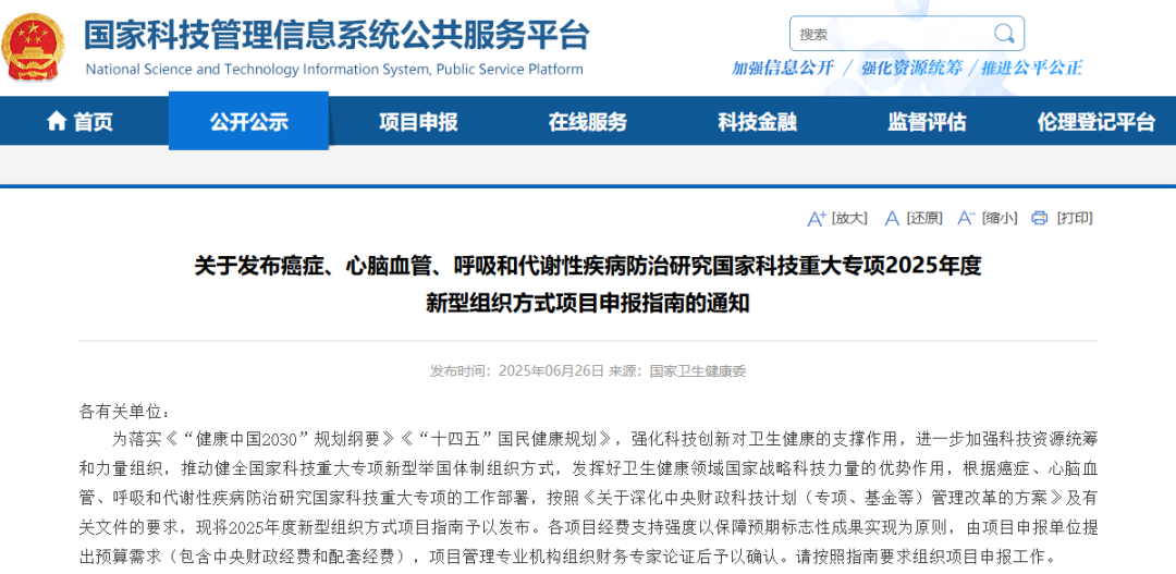 关于发布癌症、心脑血管、呼吸和代谢性疾病防治研究国家科技重大专项2025年度