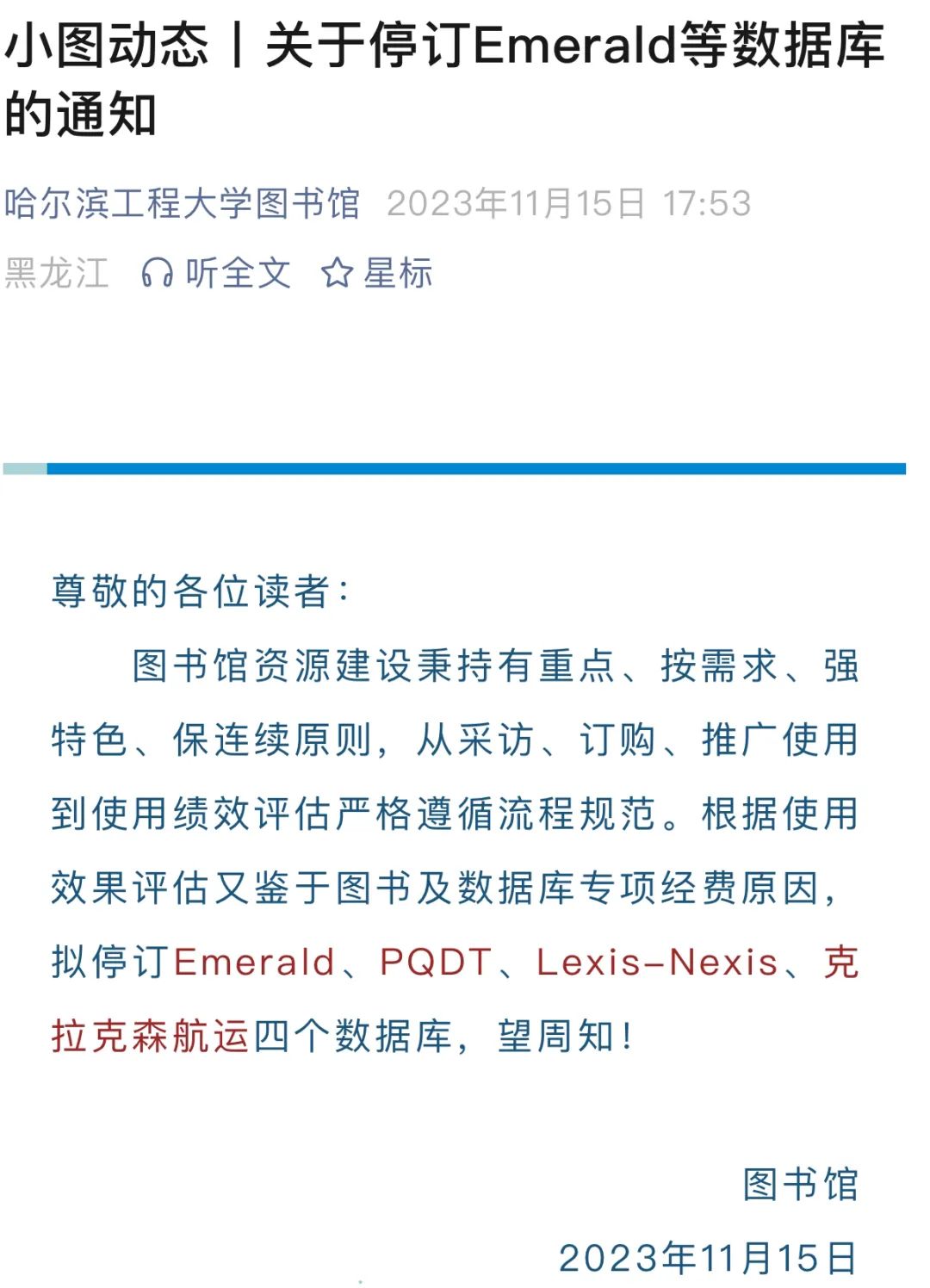 6 月 24 日,福州大学图书馆发布题为《关于停止订购爱思唯尔(Elsevier)ScienceDirect 全文期刊数据库的通知》公告,据公告,福州大学已暂停续订爱思唯尔 ScienceDirect 全文期刊数据库。