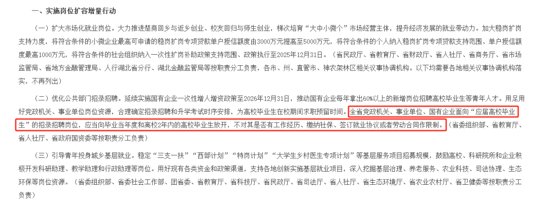 2025年6月25日,湖北省就业促进和劳动保护工作领导小组印发《“才聚荆楚 共建支点”促进高校毕业生等青年人才就业创业若干措施》。文件明确,全省党政机关、事业单位、国有企业面向“应届高校毕业生”的招录招聘岗位,应当向毕业当年度和离校2年内的高校毕业生放开,不对其是否有工作经历、缴纳社保、签订就业协议或者劳动合同作限制。