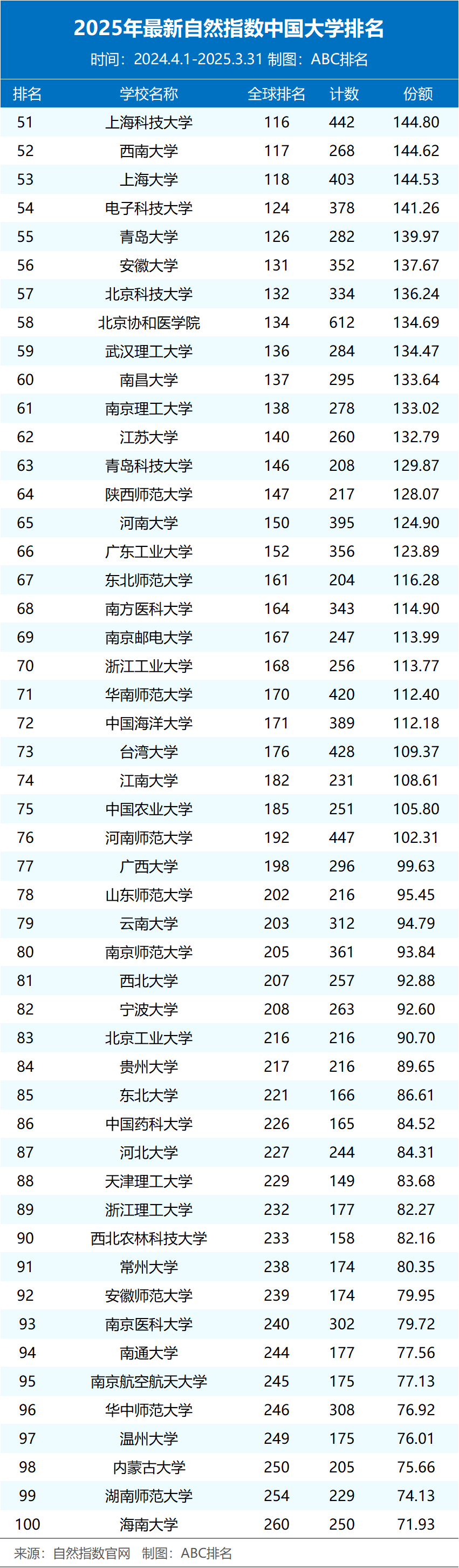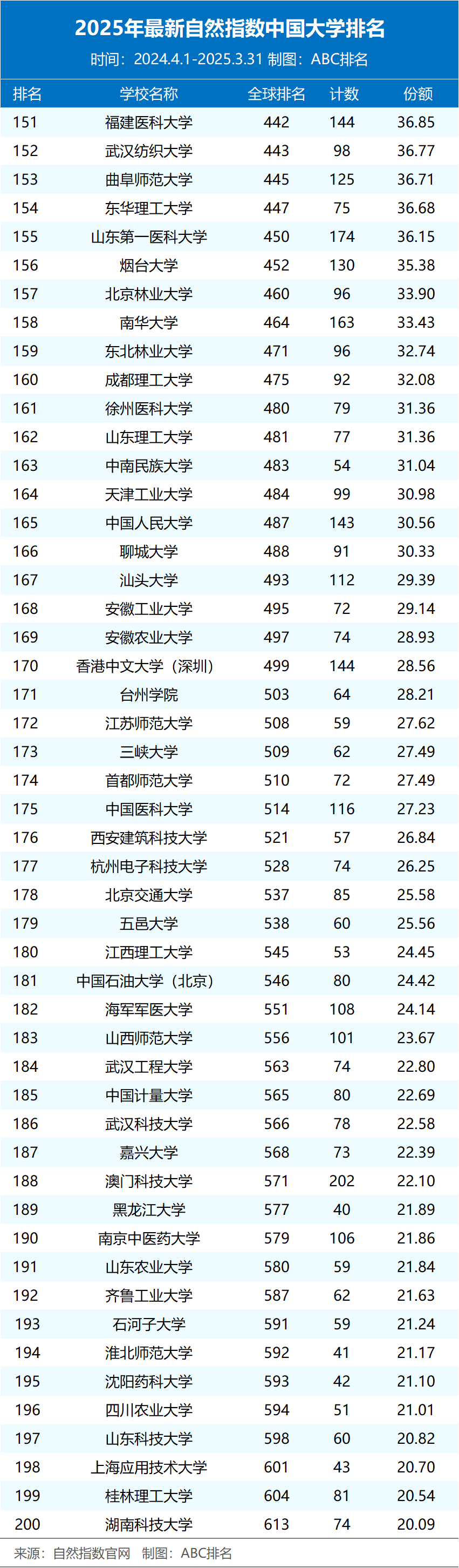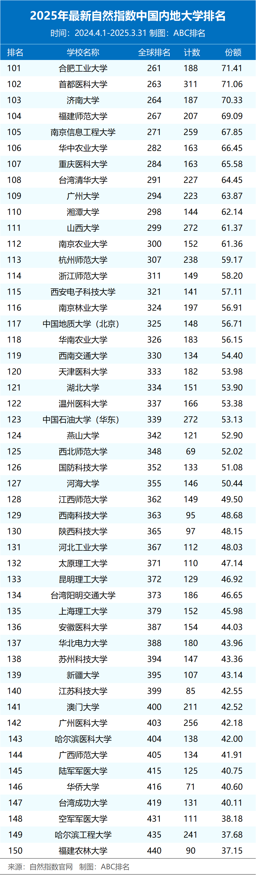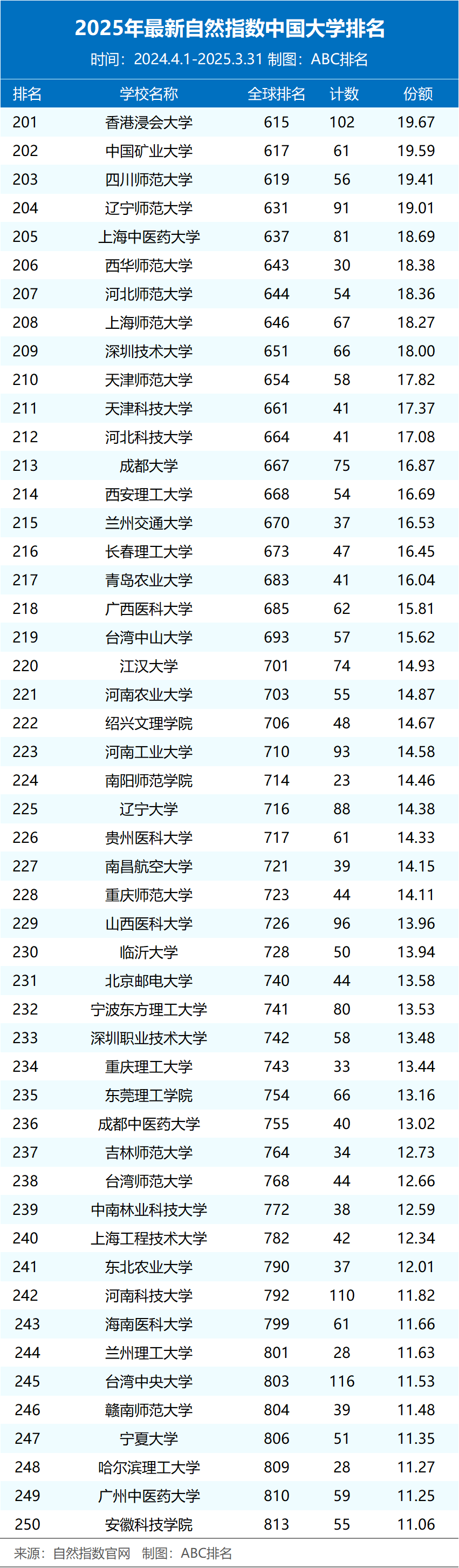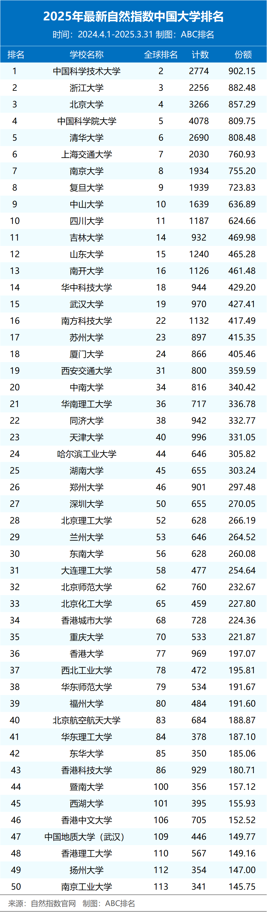 近日,2025年最新自然指数排名更新(统计时间节点为2024.4.1-2025.3.31)。