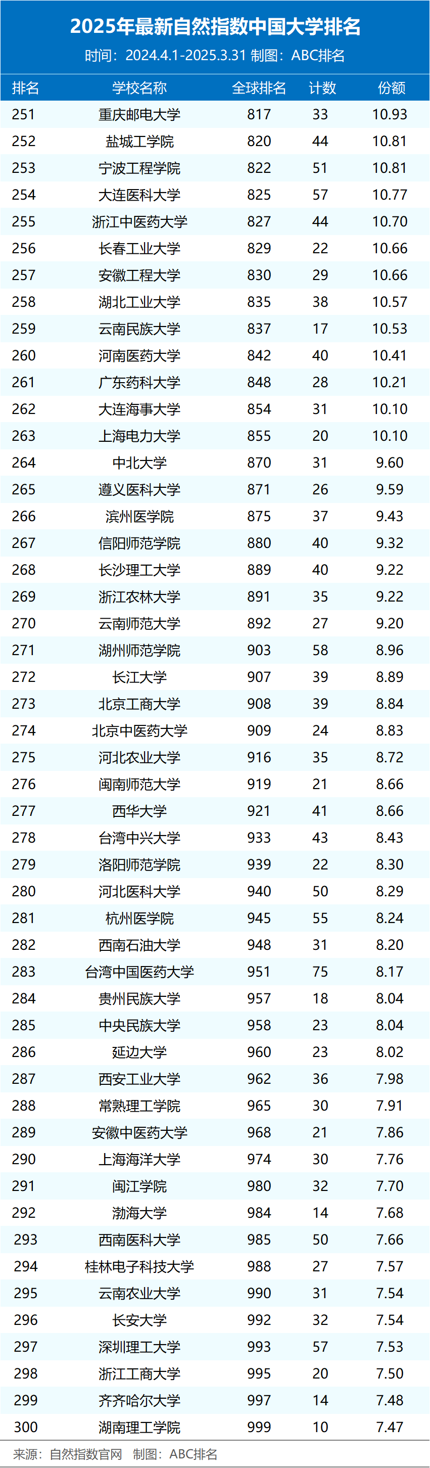 2025年最新高校自然指数排名Top300