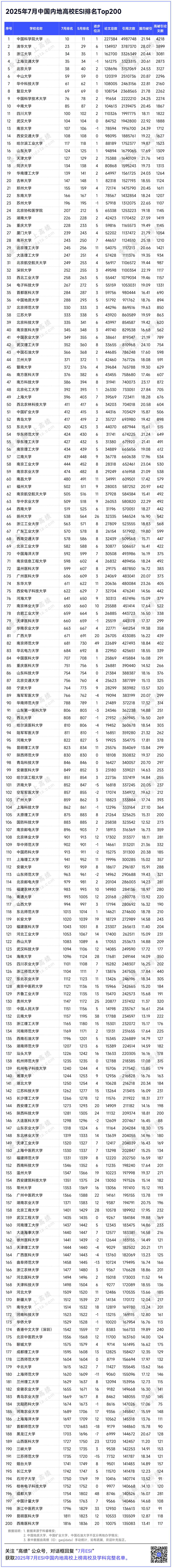 7月10日,科睿唯安(Clarivate Analytics)公布了2025年7月的ESI最新数据。ESI(基本科学指标数据库)是目前世界范围内普遍用以评价高校、学术机构、国家或地区国际学术水平及影响力的重要评价指标工具之一。本次数据覆盖时间范围为2015年1月到2025年4月。高绩(ID:gaojidata)整理了中国内地高校200强的排名情况,一起来看看哪些高校又更进一步。