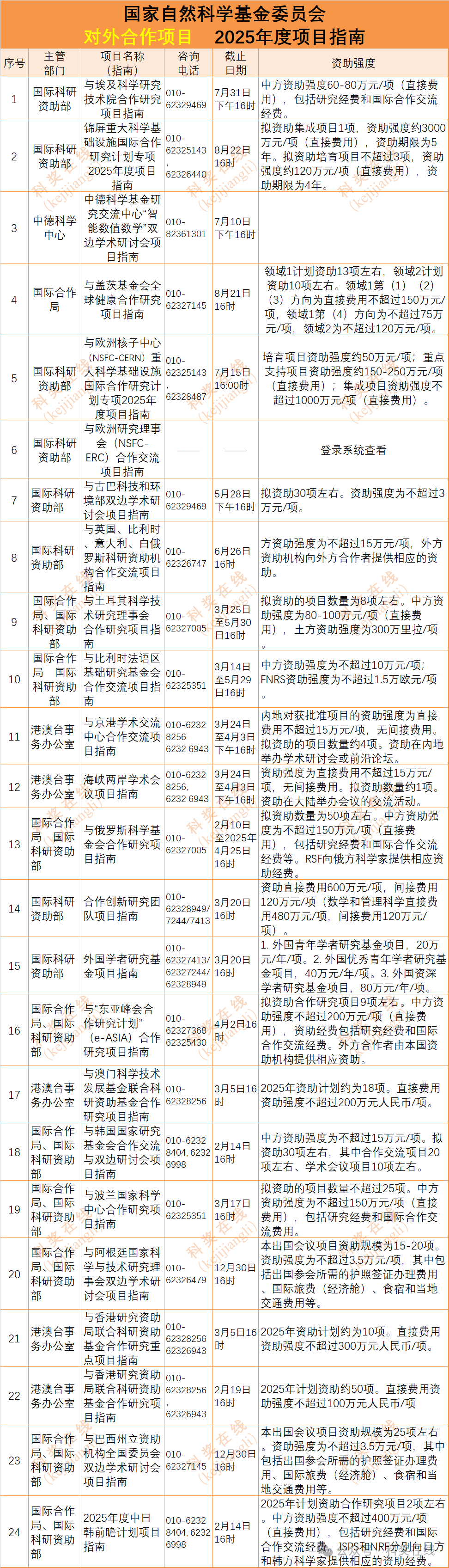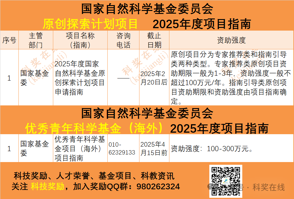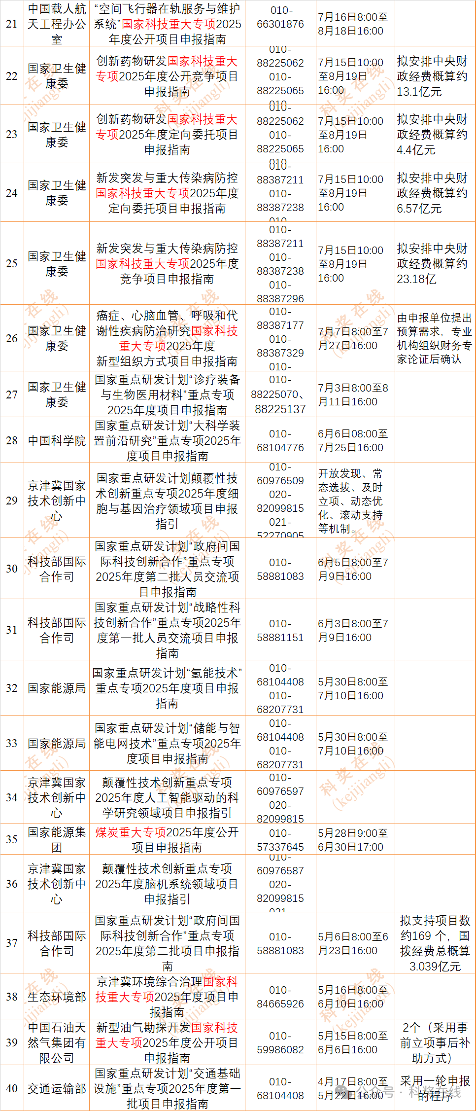 为了让大家更清楚地掌握国家科技项目的布局与申报进展,科奖在线整理了2025年度科技部发布的国家科技重大专项、国家重点研发计划,以及国家自然基金委主管的非集中申报期的重大项目、重大研究计划、专项项目(研究类)、联合基金项目、原创项目、对外合作项目、海外优青项目等的申报安排汇总,具体如下: 一、2025国家科技重大专项、国家重点研发计划申报情况 二、2025国家自然基金委非集中申报项目情况