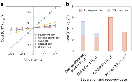 图4. (a)基于煤制气典型案例的GBL-BDO相互转化氢气分离工艺的经济敏感性分析。(b)使用GBL-BDO工艺从不同原料中分离/回收氢气的成本。ROG代表炼油厂尾气。图(b)中的蓝色柱高代表二氧化碳捕获成本的平均值,误差条表示二氧化碳捕获成本的最小值和最大值范围。