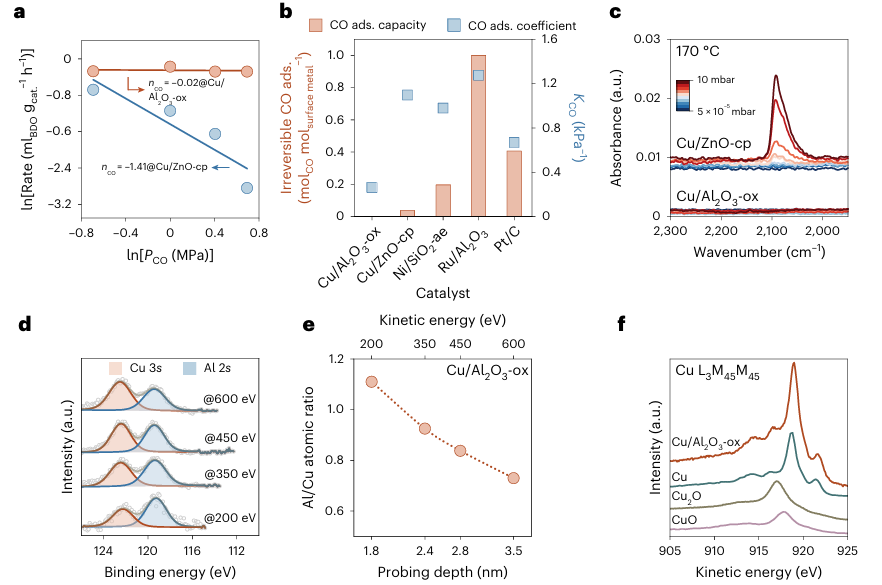 图3. (a)GBL加氢反应中CO反应级数,及铜催化剂活性测试。(b)170 ℃下一氧化碳在多种催化剂上的不可逆吸附情况。(c)170 ℃下Cu/Al2O3-ox和Cu/ZnO-cp的CO-IR光谱分析。(d)不同激发光能量下Cu/Al2O3-ox的XPS图谱。(e)活化Cu/Al2O3-ox的近表面元素深度剖析。(f)Cu/Al2O3-ox和铜标准样品的Cu L3M45M45俄歇谱图。图(a)中的数值代表三次采样的平均值,实线表示用于确定CO反应级数的线性拟合。图(b)中的数据来源于等温线拟合结果,橙色柱状图表示不可逆CO吸附容量,蓝色方块表示相关吸附系数,图(e)中的虚线作为视觉辅助。