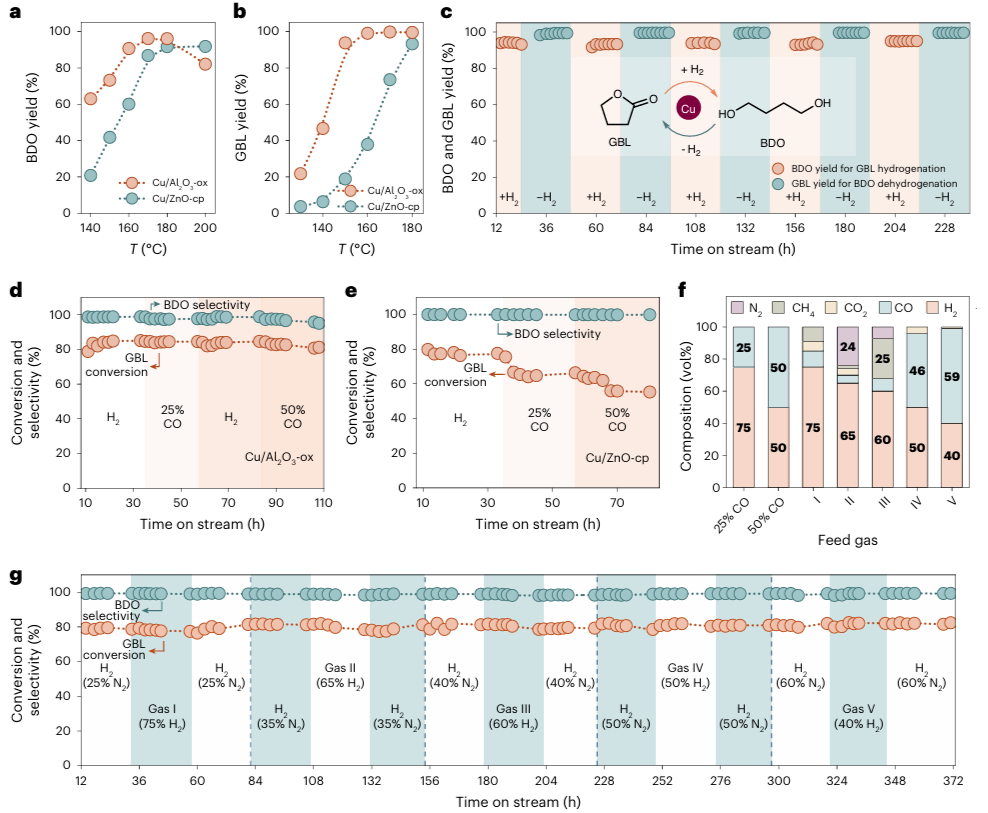 图2.(a)纯氢中的GBL加氢反应。(b)BDO脱氢反应。(c)Cu/Al2O3-ox催化剂上通过GBL-BDO相互转化进行可逆氢气捕获/释放测试。(d,e)Cu/Al2O3-ox和Cu/ZnO-cp催化剂上的GBL加氢反应的CO耐受性测试。(f)用于杂质耐受性测试的粗氢和废氢组成。(g)Cu/Al2O3-ox催化的粗氢/废氢中的GBL加氢反应。加氢条件(a,c,d,e,g):0.5 mLGBL gcat-1 h-1,H2/GBL=10。a和c中的H2压力为5 MPa,d、e和g中固定为3 MPa,通过引入N2维持压力平衡。脱氢条件(b,c):0.1 MPa,H2载气40 mL min-1,0.5 mL BDO gcat-1 h-1。c–e和g中的温度为170 °C。c-e和g中的彩色阴影突出显示了反应条件的变化。