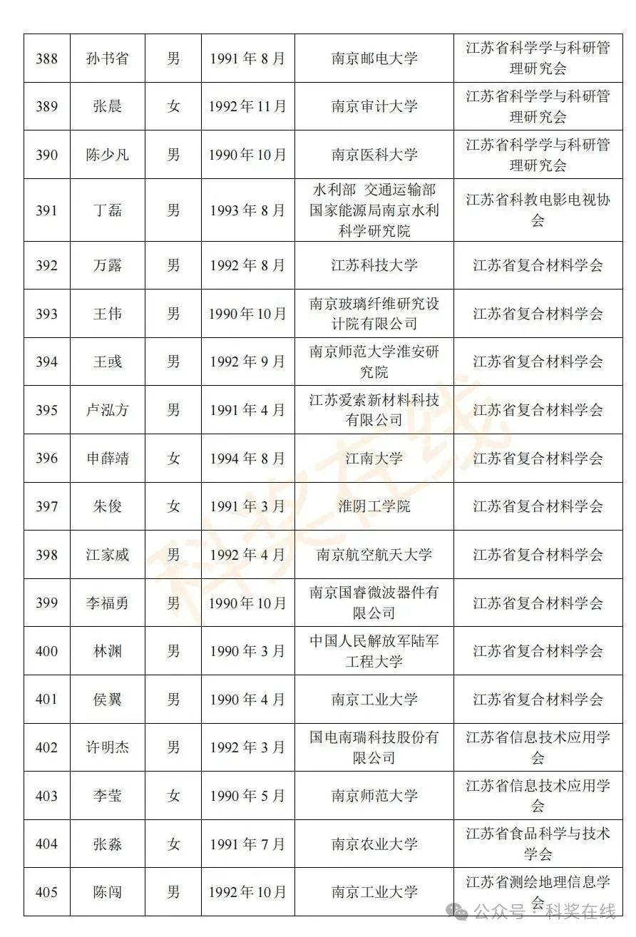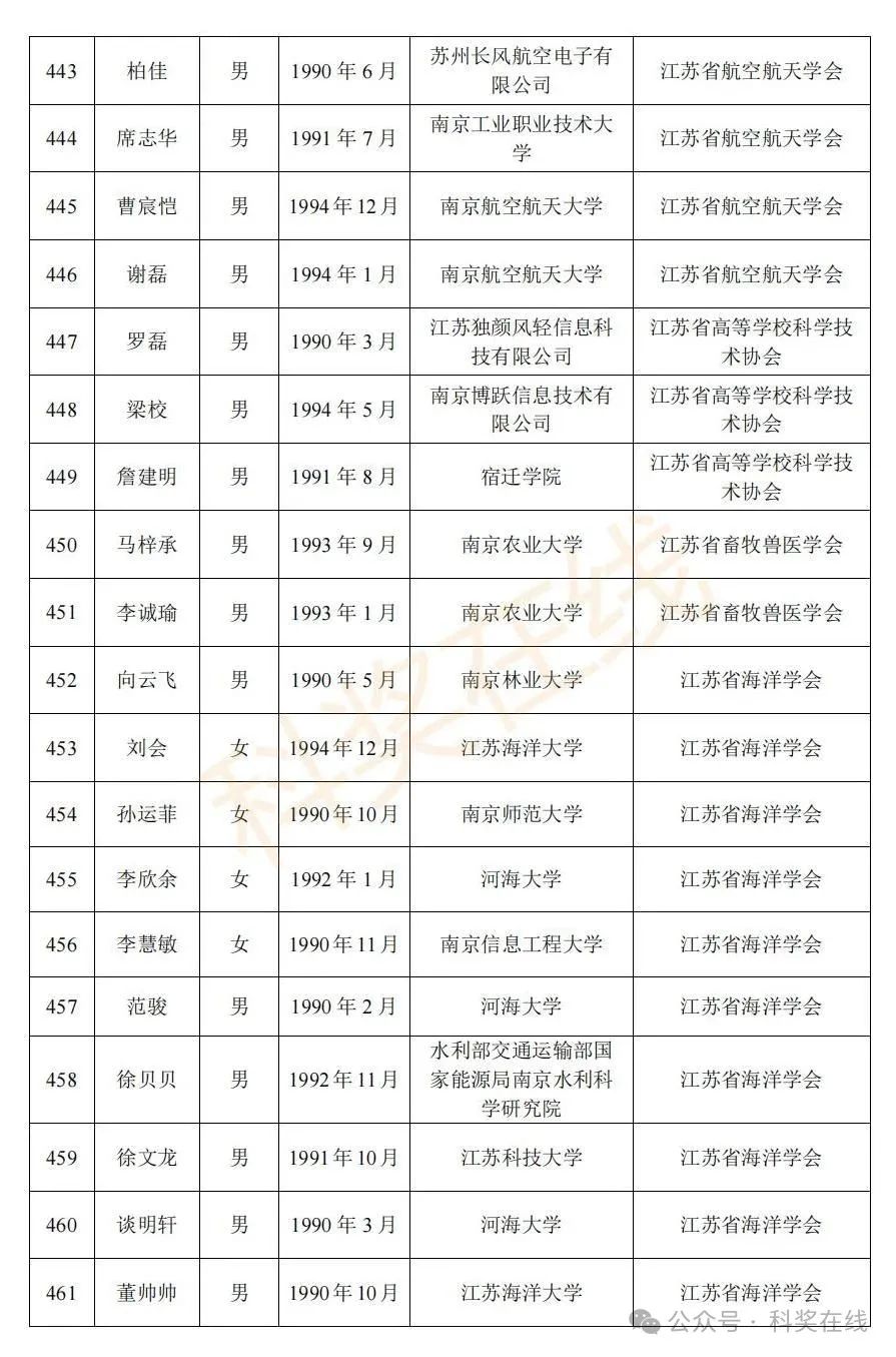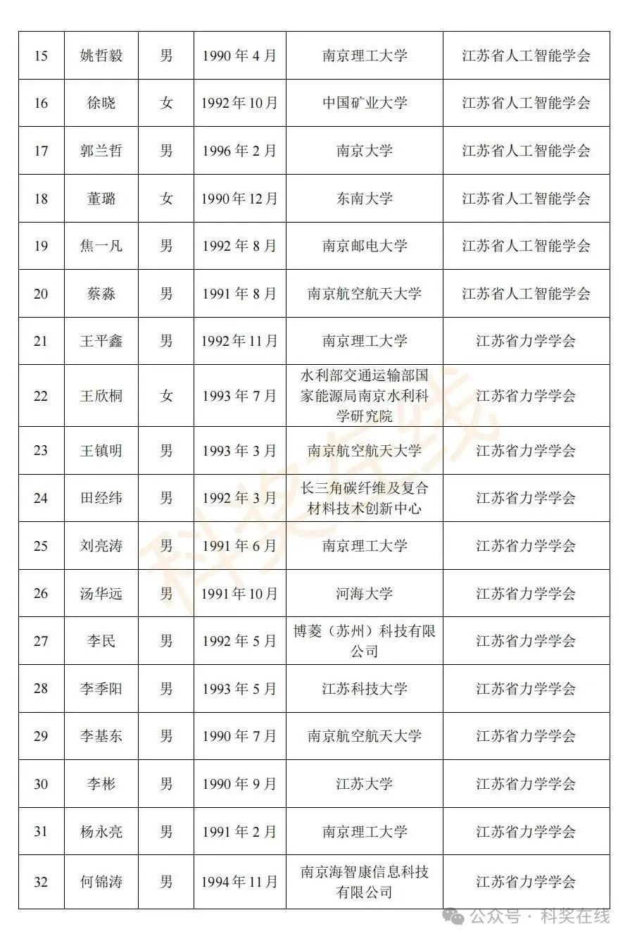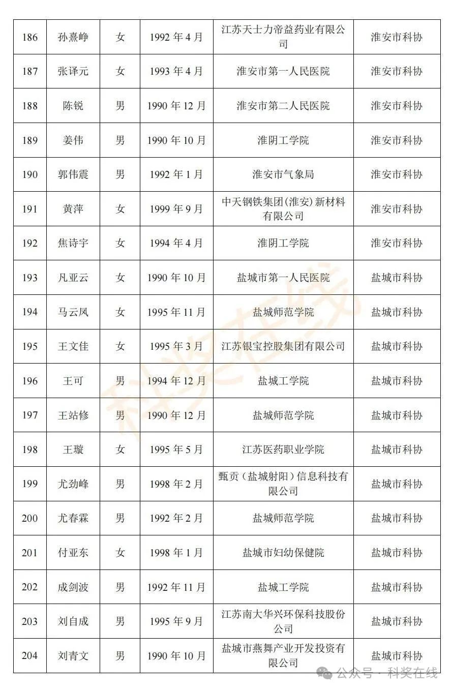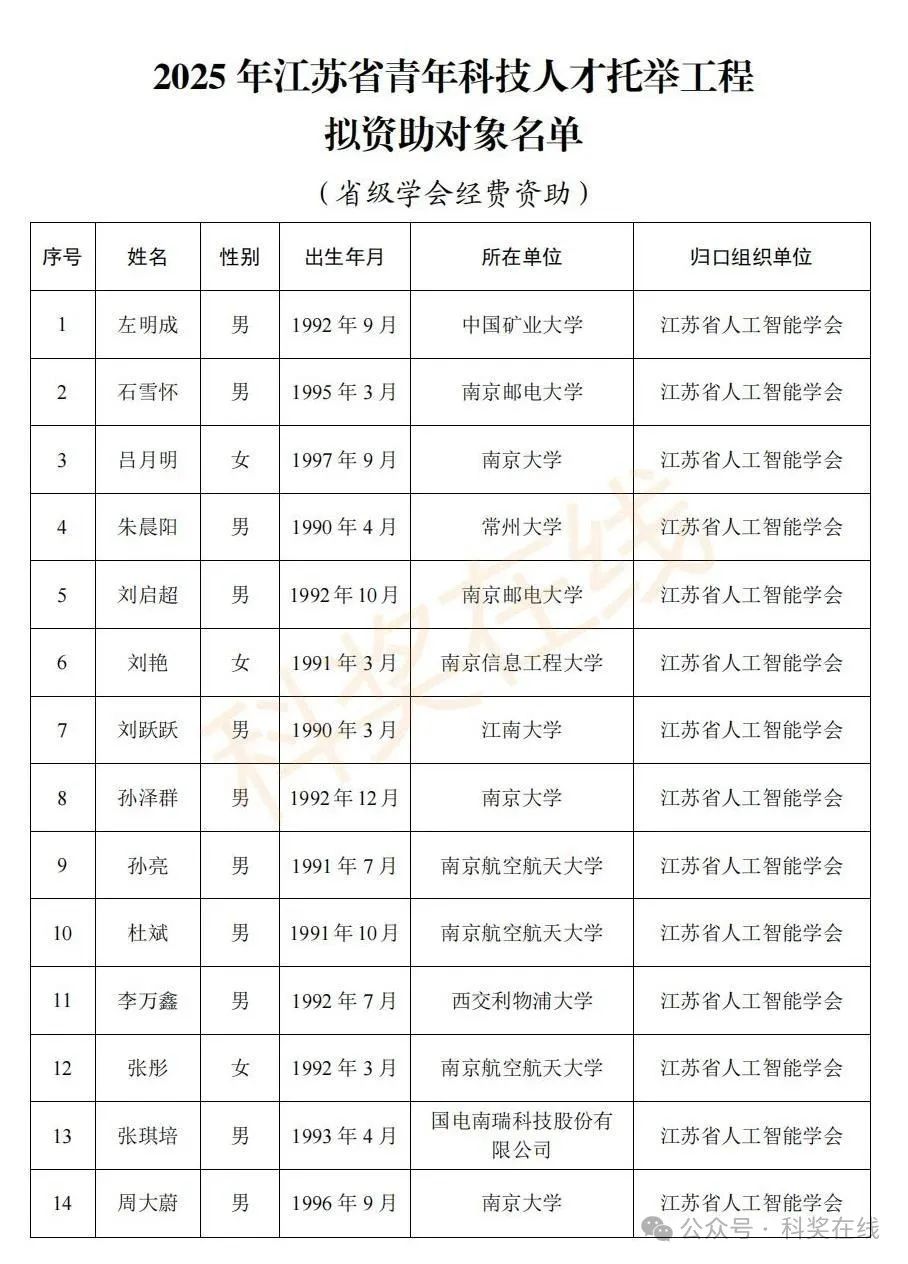 关于2025年江苏省青年科技人才托举工程拟资助对象的公示根据《关于开展2025年江苏省青年科技人才托举工程资助对象评选推荐工作的通知》,经各省级学会、省部属企事业单位、高校和设区市科协广泛发动,多渠道申报,专家评审,拟确定王再禹等1004名同志为2025年江苏省青年科技人才托举工程资助对象,现面向社会公示。