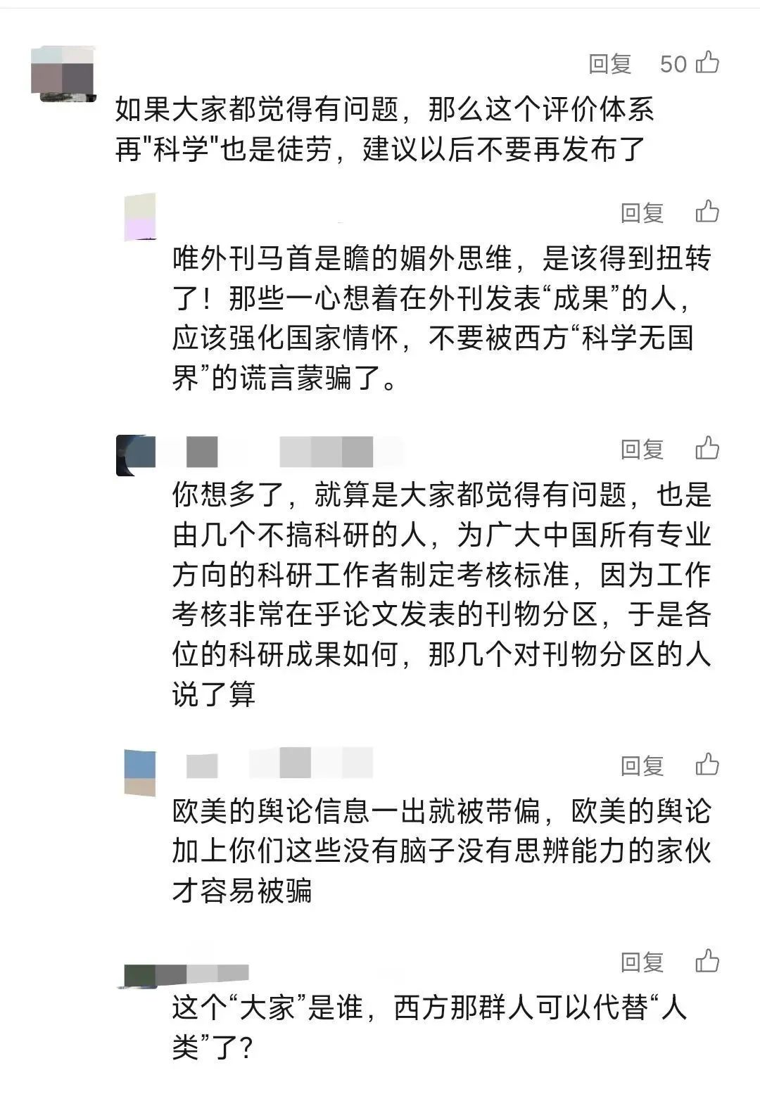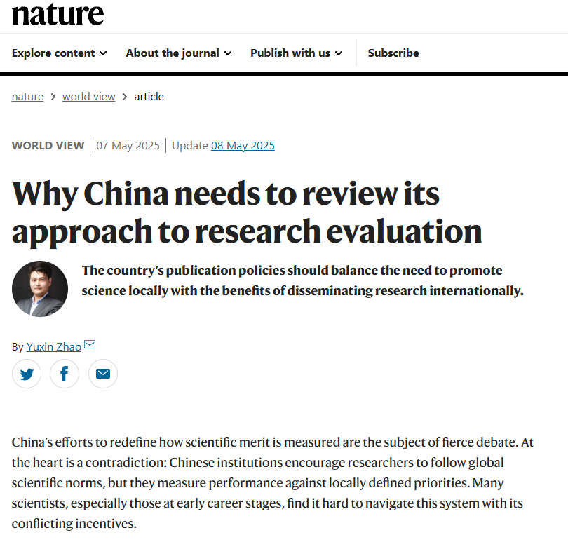 2025年5月7日,西安交通大学研究员、博导赵宇鑫在Nature 发表了一篇题为“Why China needs to review its approach to research evaluation(中国为何需要重新审视其科研评估方法)”的文章。对今年早些时候发布的 2025 年中科院分区表提出了质疑。文中称,有证据显示,迫于对当前的评估框架的无奈,中国学者在选择投稿期刊时会迎合中科院排名,放弃那些被“降级”的期刊,从而满足晋升和评价要求。但这次分区,使得一些国内期刊在这次中科院分区中被“提级”,而被领域内广泛认可的国际期刊却遭到降级,被质疑"升内降外",这让那些把论文发表在后一种期刊上的学者在国内的学术评价中处于不利局面。