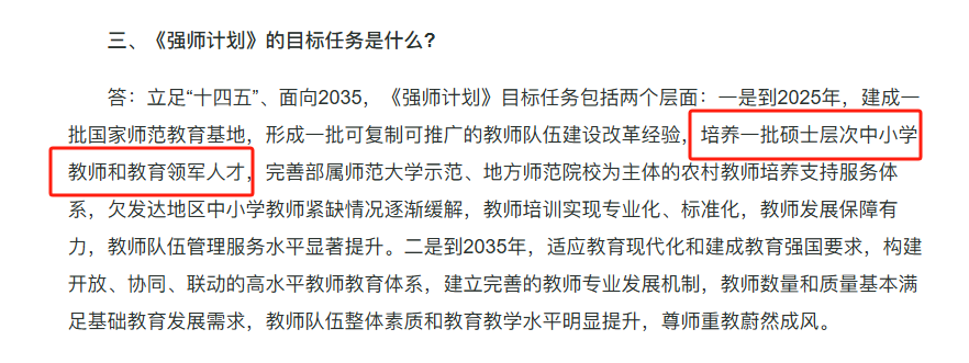 2022年,教育部等八部门关于印发《新时代基础教育强师计划》的通知明确提出,新时代基础教育强师计划的目标任务之一是:到2025年,建成一批国家师范教育基地,形成一批可复制可推广的教师队伍建设改革经验,培养一批硕士层次中小学教师和教育领军人才。