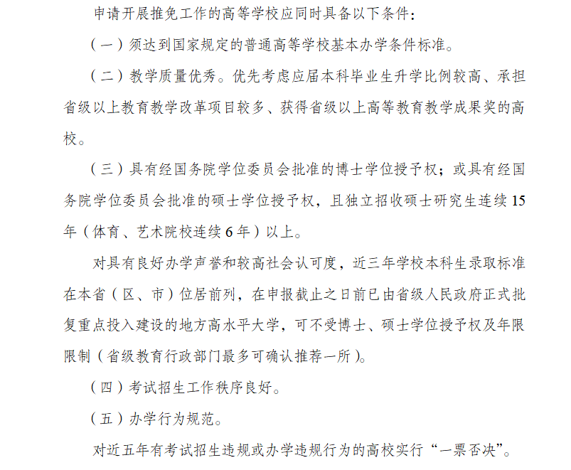 2017年,《教育部办公厅关于印发〈新增推荐优秀应届本科毕业生免试攻读研究生普通高等学校申报确认办法〉的通知》(以下简称《通知》)规定,新增推免高校需符合以下条件: