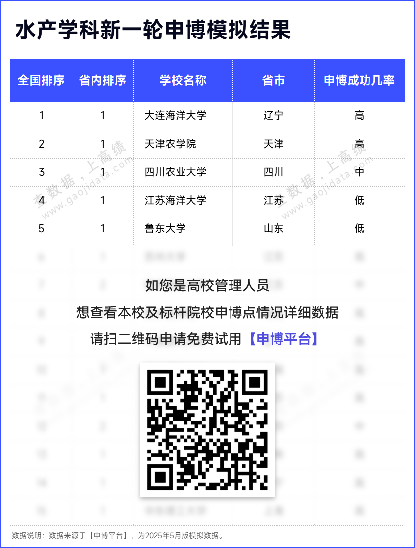 根据【申博平台】模拟结果,学校的水产学科在全国及辽宁省内的排序均为第1名,申博成功几率为“高”。