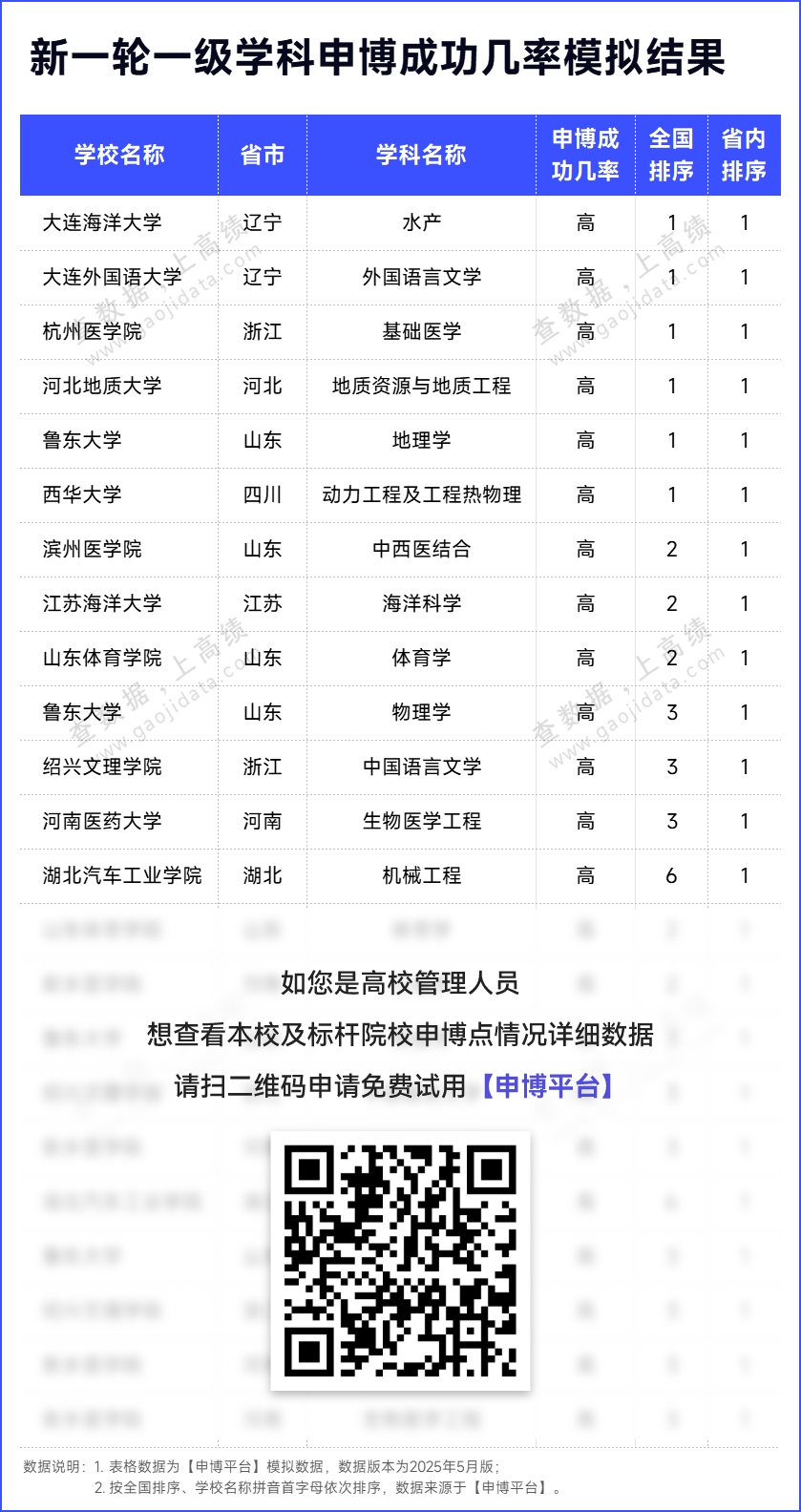 新一轮申博模拟数据来源于【申博平台】。该平台是专门服务于高校博士点申报工作的一站式平台,集聚学科专家的经验和智慧,能够帮助学校分析申博学科的当前水平、评估申博学科的成功几率、优化申博学科的申报策略、打磨申博学科的申报材料。授权用户可登录【申博平台】,查看本校及对标学校申博点具体情况。未授权用户可以扫描下方二维码,申请免费试用。