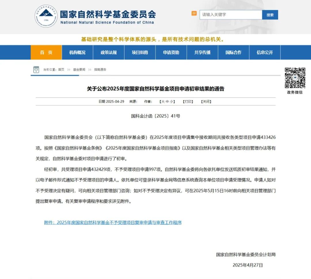 经初审,国自然基金委共受理项目申请432429项,不予受理项目申请997项。