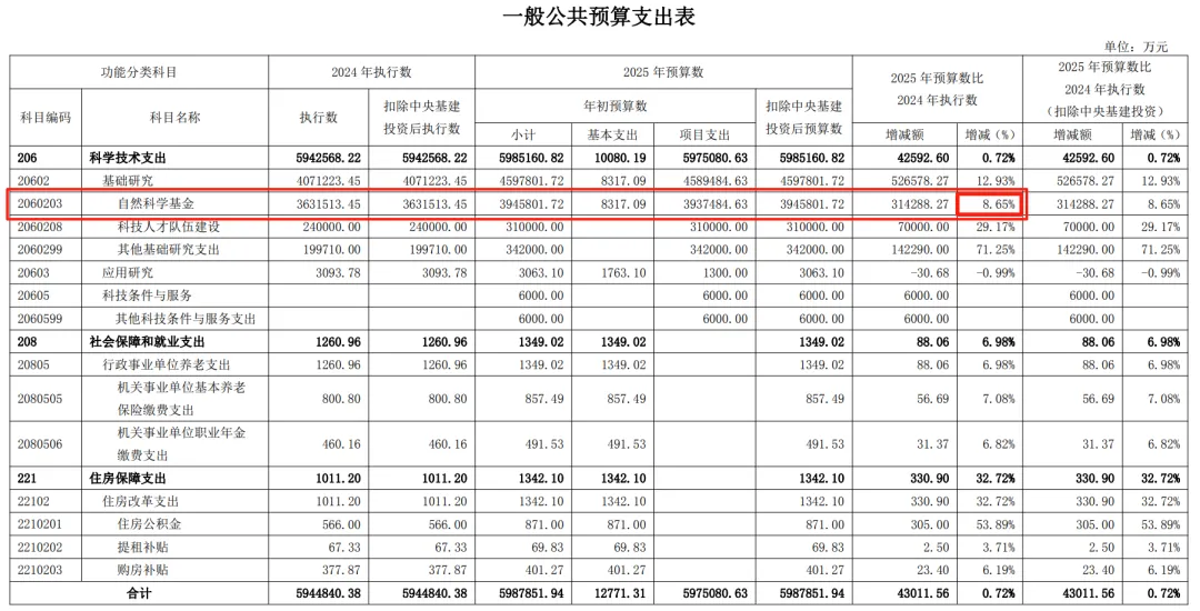 今年基金委接收的项目申请又创历史新高。和去年的383123项比起来,增加了近5万项,49306项。是去年增长量(80231)的6成多,是前年增长量的近5倍(4.92)。今年的增长率虽然较去年有所降低,但仍是前些年的3倍,高达12.7%,前些年的增长率仅在4%左右。此外,今年在接受项目数量创历史新高的基础上,不予受理项目数量上还创了历史新低,低于1000项,仅为997项。要知道在2017-2020年间接收项目数量多,不予受理项目数量也是多的(除2020年外均超过3000项)。根据国自然官网公布的基金预算表来看,2025年国家自然基金增幅为8.65%,增加的比例较去年的6.25%有所上涨。
