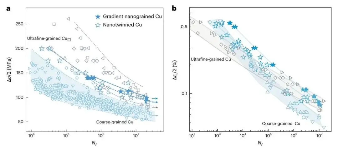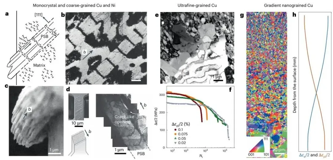 图1、疲劳强度与拉伸性能的关系© 2025 Springer Nature Limited 图2、应力应变控制下的疲劳寿命© 2025 Springer Nature Limited 图3、不同微观结构纯Cu的疲劳机制© 2025 Springer Nature Limited 图4、合金的疲劳机制© 2025 Springer Nature Limited 图1系统揭示金属疲劳强度(σ-1)与抗拉强度(σUTS)的非线性关联,指出均质材料(如超细晶铜)因塑性丧失导致低周疲劳寿命骤降,建立异质结构设计理论基础;图2对比不同材料的疲劳性能:梯度纳米晶铜(GNG-Cu)在相同应变幅下寿命较均质材料翻倍,且高取向纳米孪晶铜(nt-Cu)同时实现高疲劳强度(90MPa)与长寿命,突破传统强度-寿命矛盾;图3通过原位电镜揭示机制:梯度结构通过分层屈服抑制应变局部化;图4验证极端环境应用:梯度位错结构304不锈钢显著降低棘齿应变速率,层状金属陶瓷复合材料通过界面韧化机制阻断裂纹扩展,凸显其在多场耦合载荷下的工程价值。