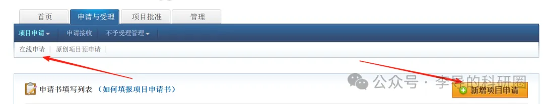 点击 “申请与受理”中的“项目申请”,然后点击“在线申请”,“新增项目预申请”。