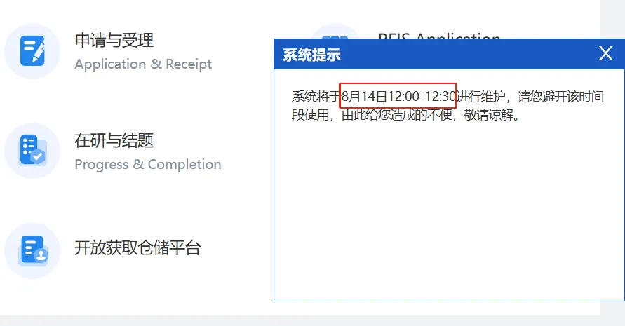 刚刚,登录国自然基金委平台后,弹窗显示“系统将于今日8月14日12点-12点半进行维护,请您避开该时间段使用,由此给您造成的不便,敬请谅解”