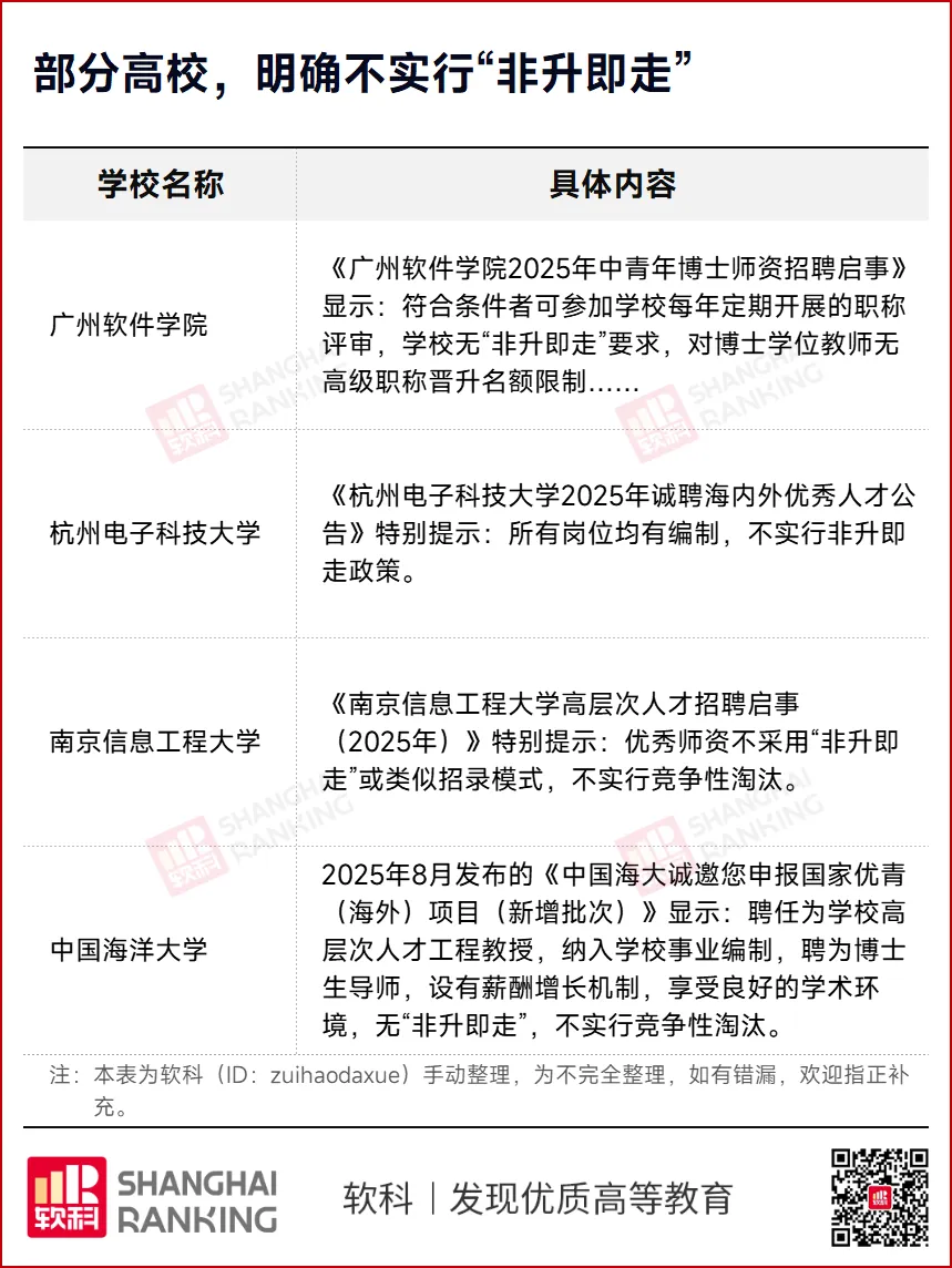 处于“非升即走”争议漩涡的高校,也开始重新审视这一制度。其中,有部分高校宣布:不采用“非升即走”或类似招录模式,不实行竞争性淘汰。
